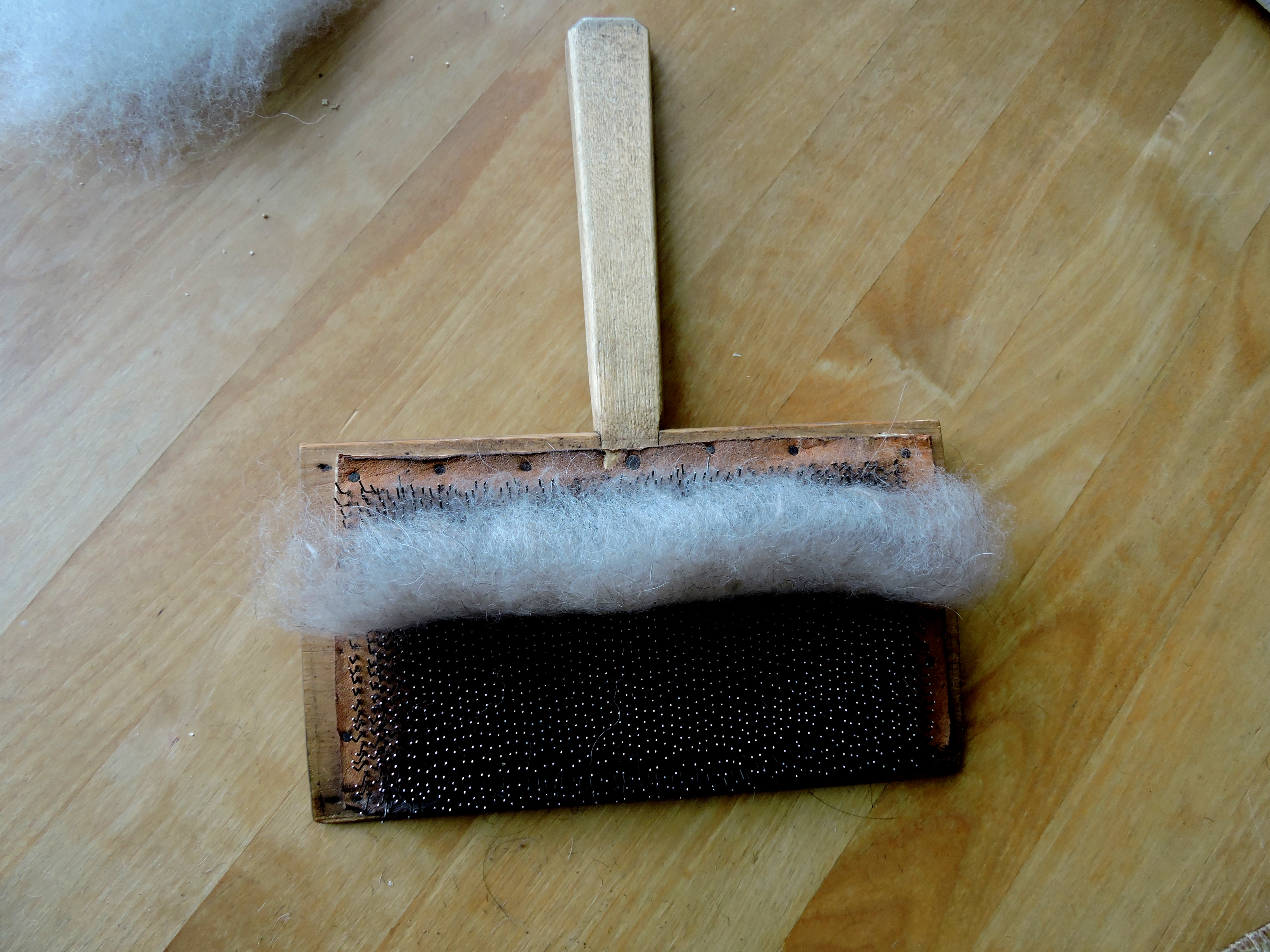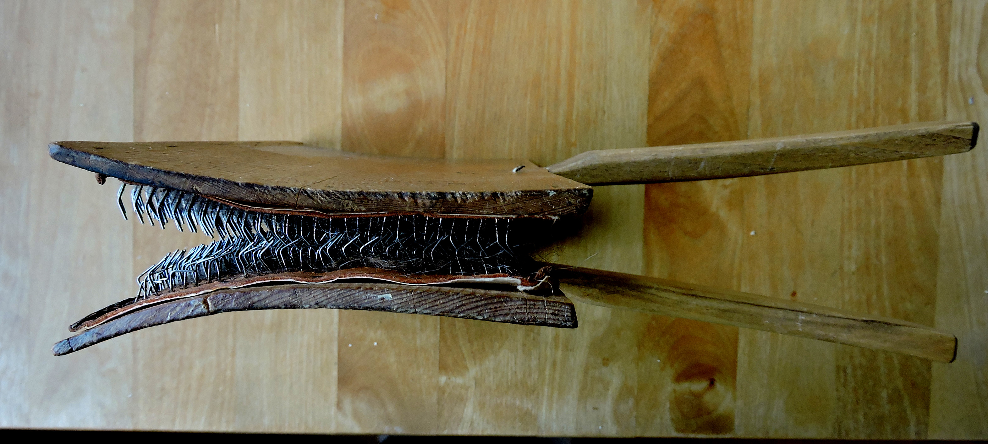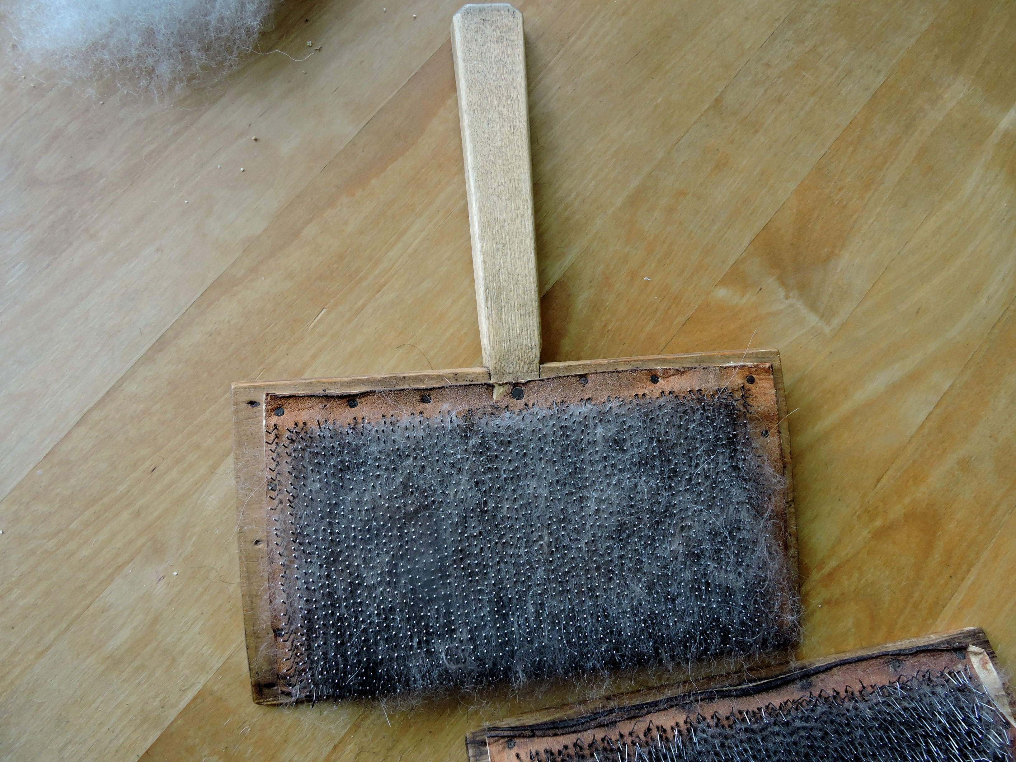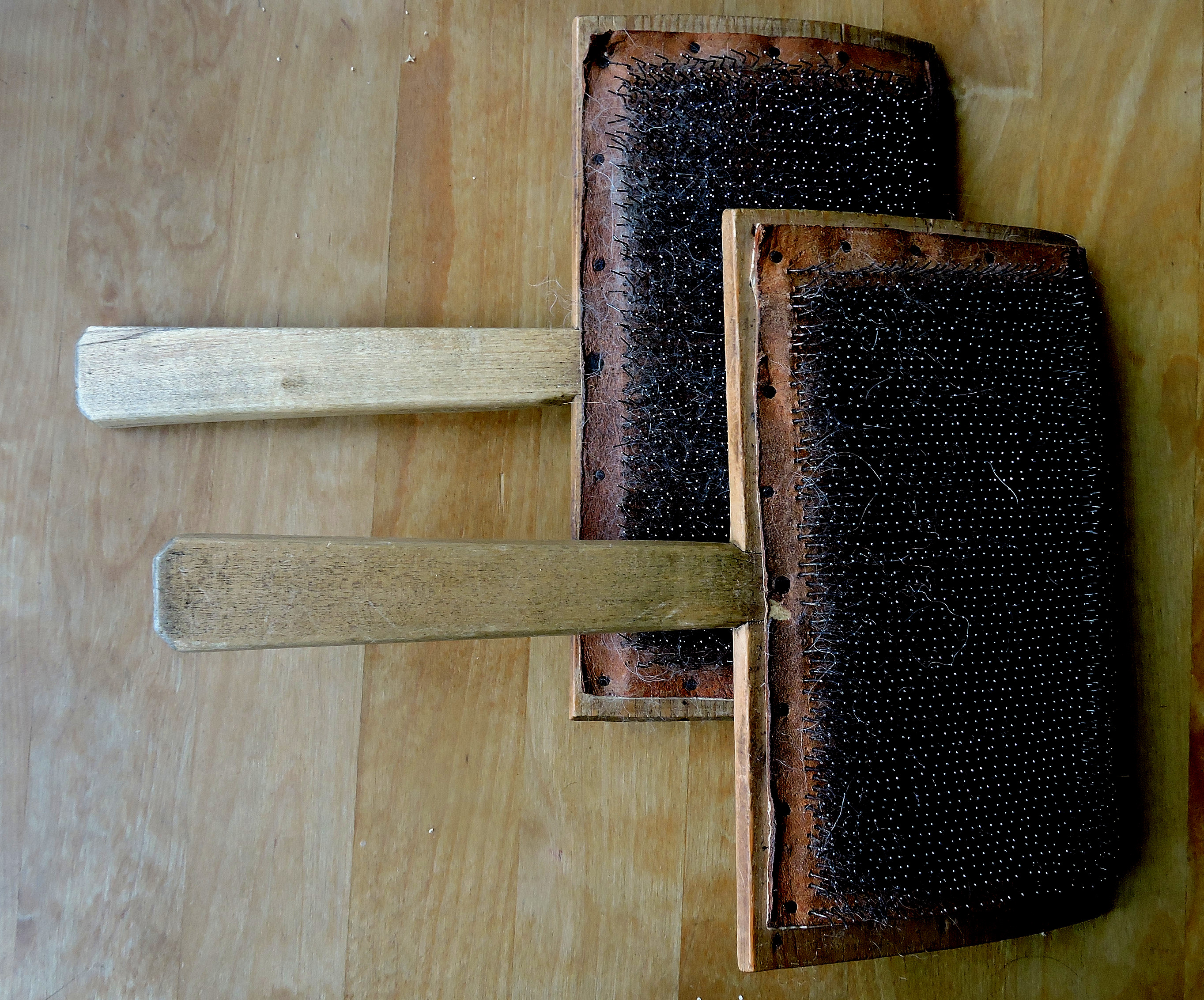Kardorna fick komma ut ur sin långa sömn och sen tittade jag på nätet vad som tillkommit eller försvunnit sedan 60-talet och såg att det fanns många valmöjligheter som inte existerade då. Mina bästa kardor är de gamla som jag ropat in på auktioner på Gotland och som fått nya kardläder.  De är superlätta, tunna och lätt böjda och de flyger när man arbetar med dem. De flesta nyskapade är tunga, skaften ofta felvinklade och tillverkade utan öra för den som ska använda dem länge.