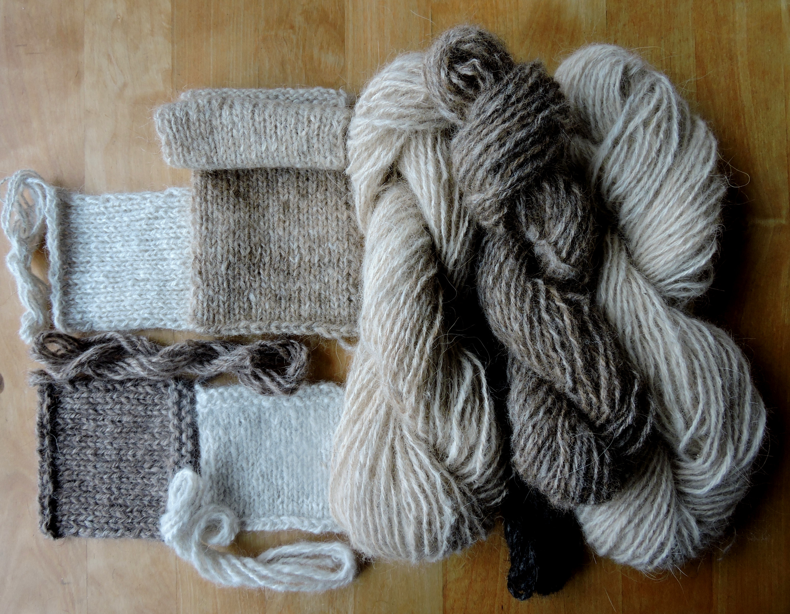 Till nya vantar vill jag göra tretrådigt garn, dvs tre trådar ihoptvinnade till en. De hundhår jag prövat ur påsen från Karin var från schamponerade och klippta hundar, kammad ull är nog inte så vanligt från hundtrimmare, men om den klippta är tillräckligt mjuk så tror jag att den med stöd av lite finull ändå kan bli bra.