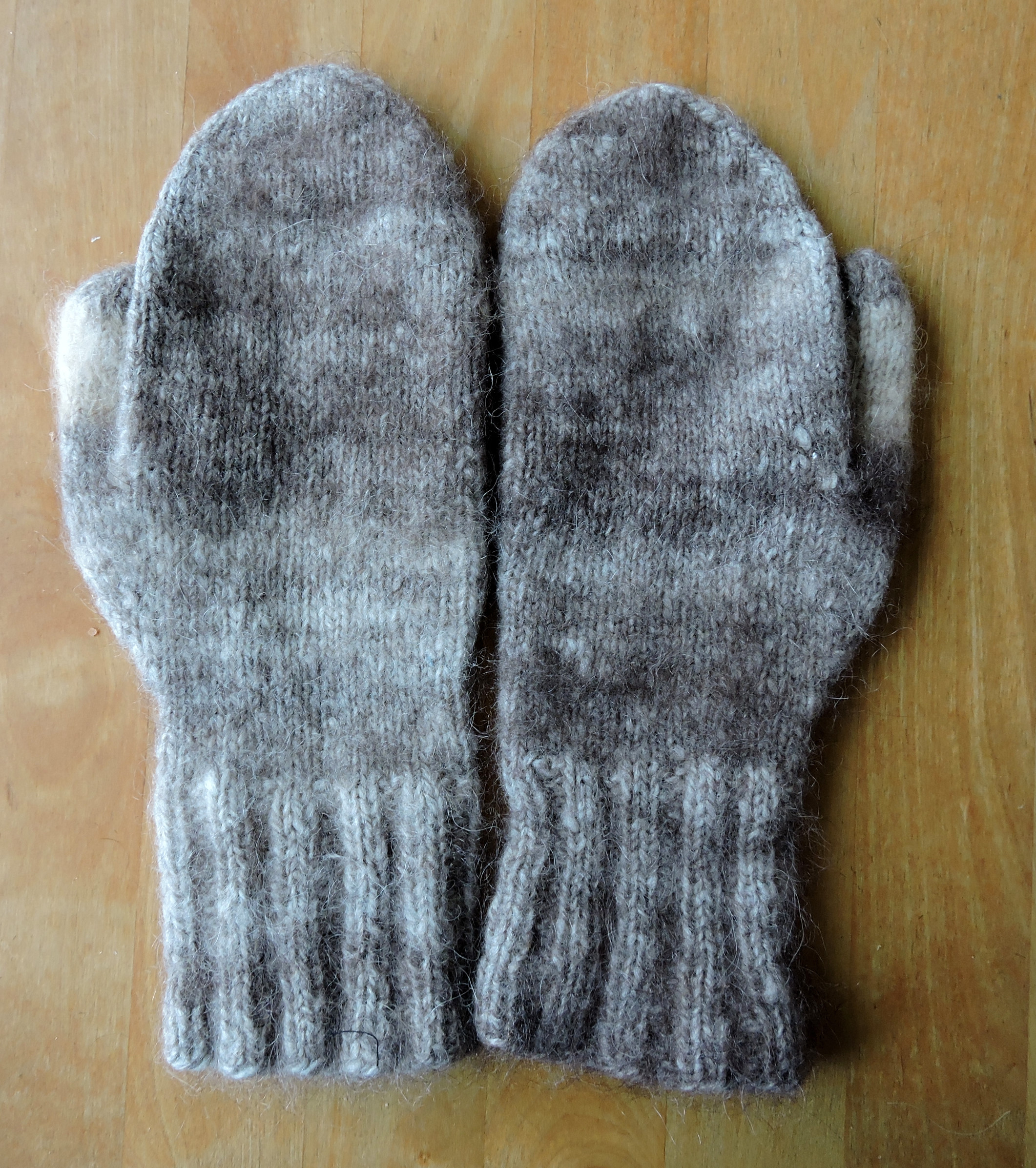 Då vi hade hundar på 60-talet, Shetland Sheepdog, samlade vi deras utkammade bottenull, spann till garn och det stickade vi vantar av. De blev varma och täta och sög inte upp vatten och ett par av dem finns fortfarande kvar och de tar Lasse på sig om vintern, för händerna som håller rullatorhandtagen blir annars iskalla.