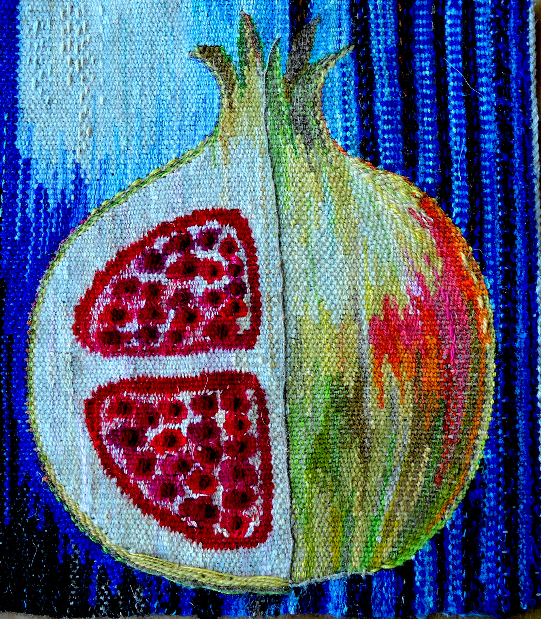 Granatäpplen låg inte i svenska fruktdiskar förrän ganska sent, vi hade ingen vana att vare sig plocka ut eller äta kärnorna och det enda vi visste var att grenadin som förekom i drinkrecept kom från de röda kärnorna. De första som kunde köpas var gulgrönaktiga med rosa och orange skiftningar och färgen var så intrikat så man kunde fastna helt i bara den. Det där med att öppna en frukt (eller något med skal) och ut kommer något helt oväntat, var något jag samlade på och granatäpplet hade väl just den överraskningen. Då jag gått en första bildvävningskurs på HV på 60-talet, var det ett sådant jag ville försöka beskriva i en väv. Jag blev inte nöjd och och lappen blev liggande, men nu 50 år senare minns jag hur fascinerad jag var över formen och hur viktigt det kändes att få till det.