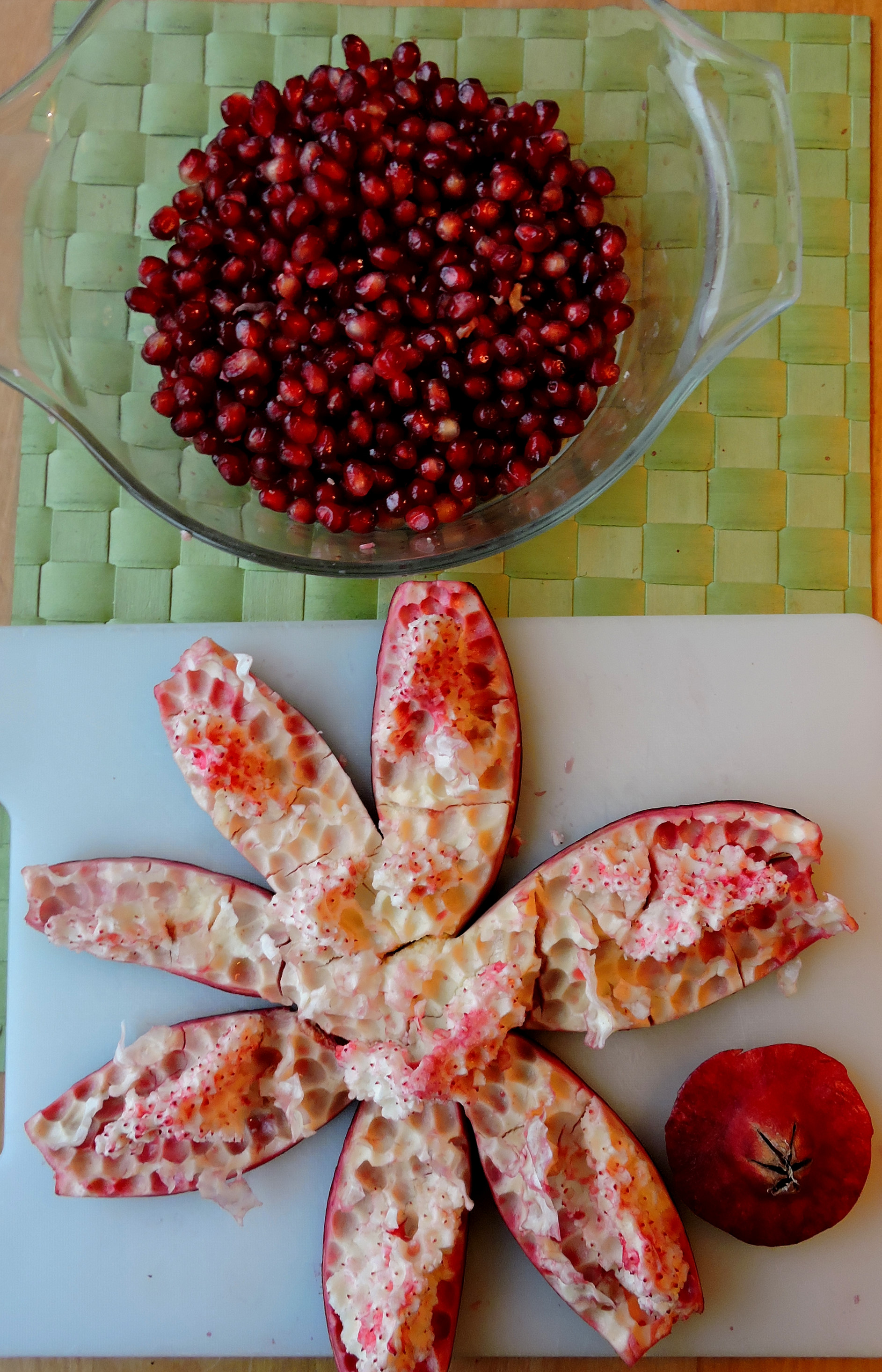 För några dagar sedan när Karin hämtade min äldsta spinnrock för att spinna på, hade hon med sig ett granatäpple. Det var det största jag sett. Djuprött och tungt som en stenkula, 7 hg. Bara ytan var något att känna på länge och de röda färgskiftningarna var rödare än något annat. Karin ville att vi skulle öppna äpplet men det fick ligga tillsammans med päronet från Carrara ett par dagar och de trivdes bra ihop. Sen började jag kolla på nätet och såg hur välgörande de röda kärnorna skulle vara, att man behövde ett enkelt sätt att få ut kärnorna och det fanns beskrivning på youtube. Skära av ett lock, snitta skalet i klyftor och vika ut, banka med en träsked på skalet och alla kärnor lämnar sina inbäddningar.