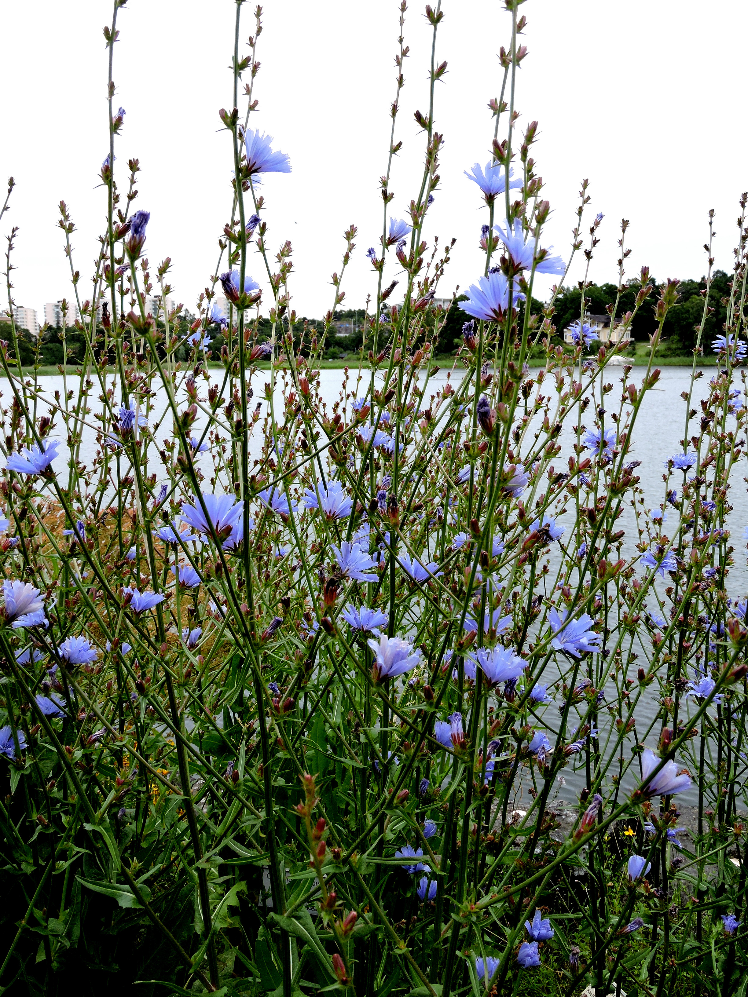 På den smala remsan utmed vattnet blommar Ölands och Gotlands växter, här Cikoria,
