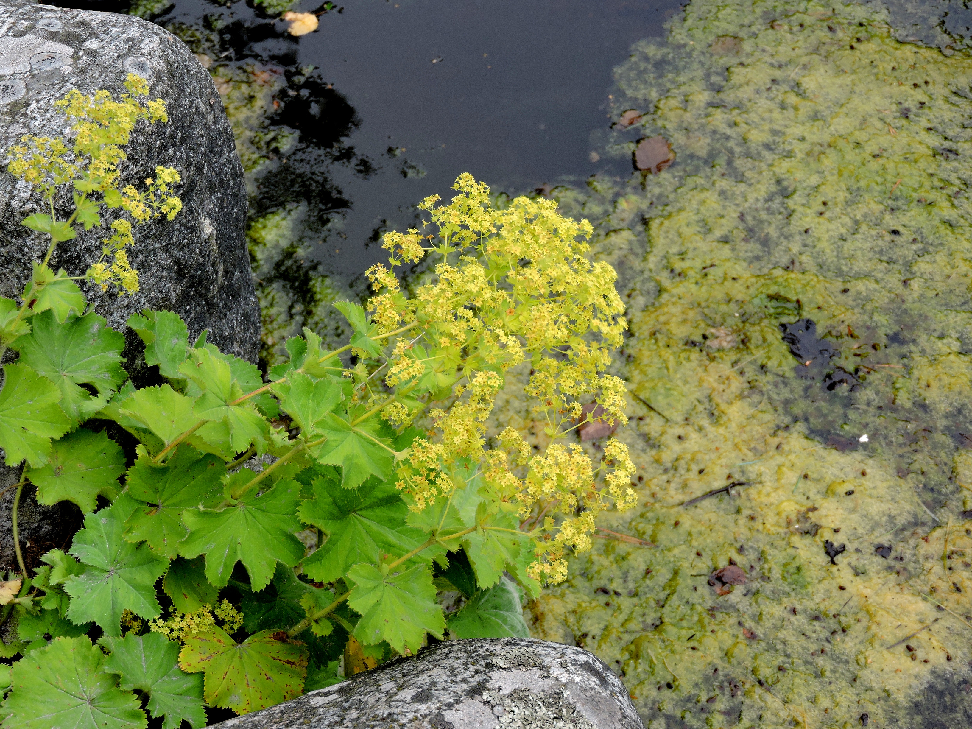 Dammen har ett gröngult täcke som går i färg med de blommande daggkåporna. I år måtte någon med trädgårdsinflytande sagt ”Daggkåpa” för den finns överallt, blommar som gröngula ångor särskilt i mitten av rondeller men också här utmed dammen.