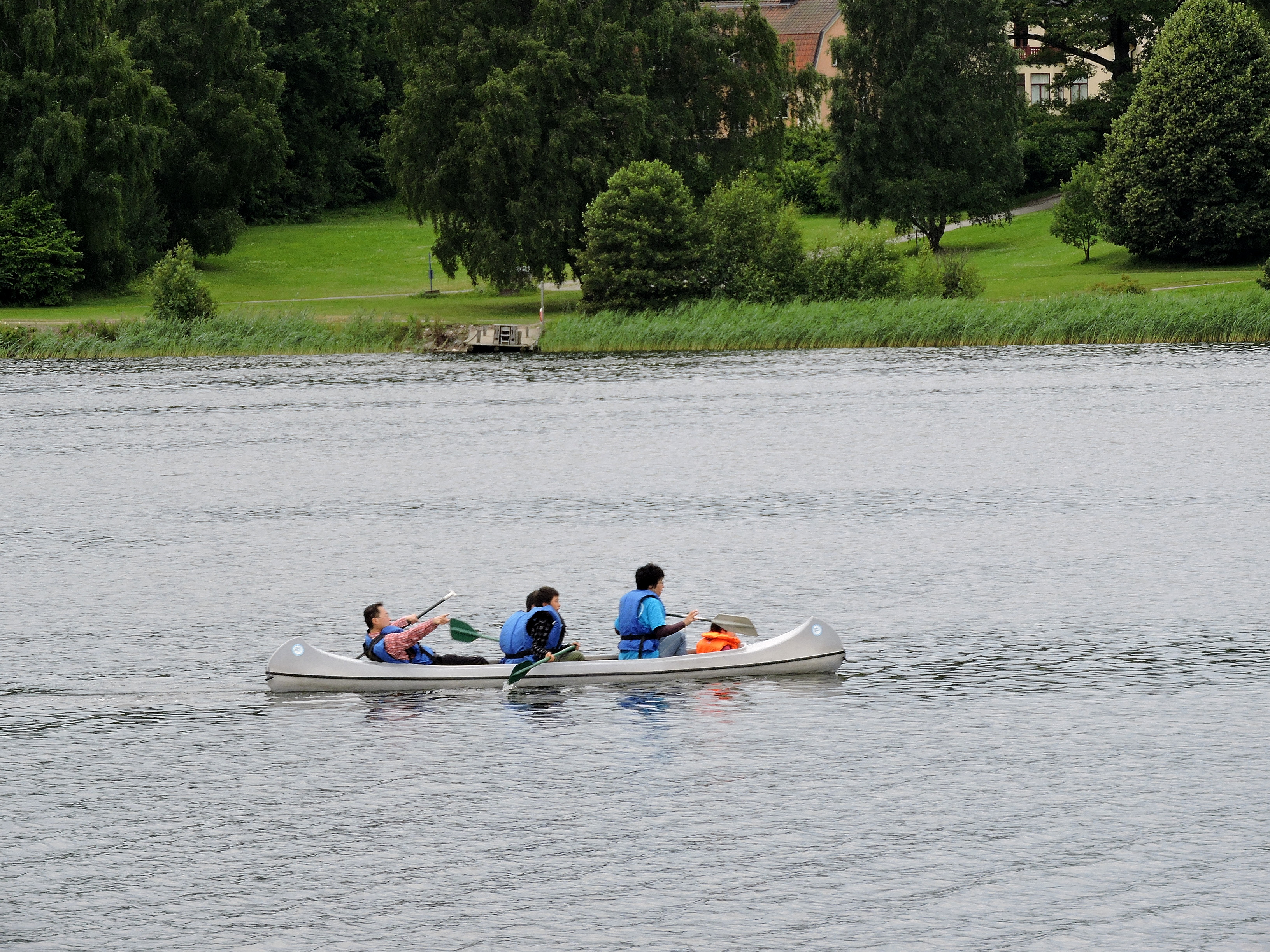 och ute på vattnet ser vi bara en kanot. Det är alldeles stilla i luften och har vi tur så hinner vi runt och till en kopp kaffe innan det börjar regna.