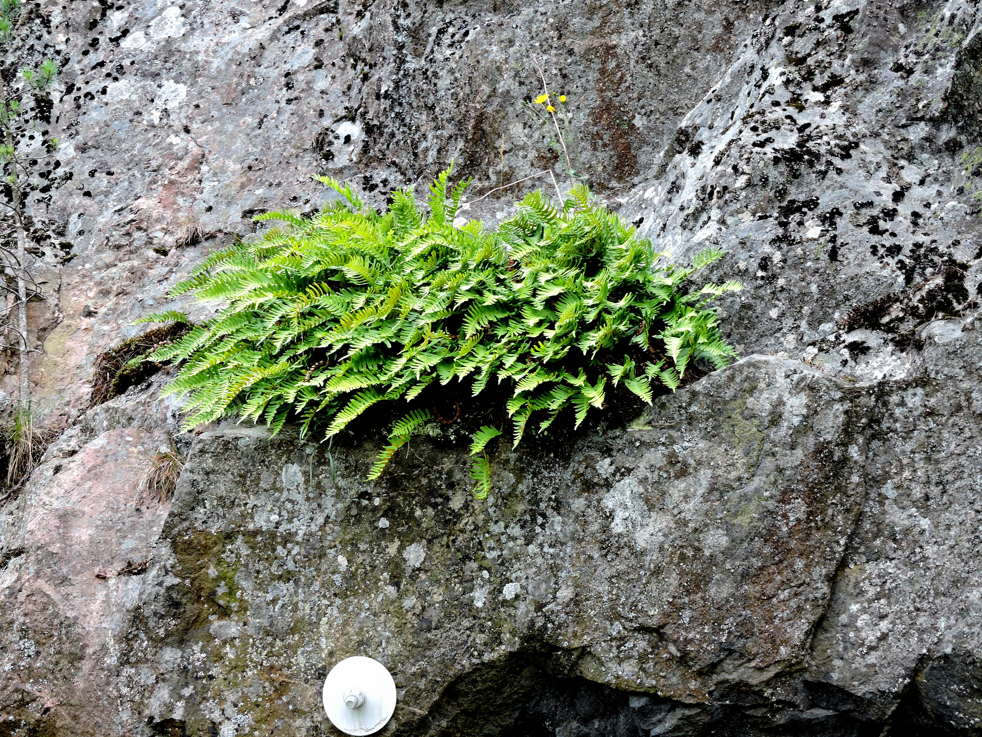 Utmed hela bergväggen ovanför och mellan grottorna har stensötan hittat sprickor att växa i.