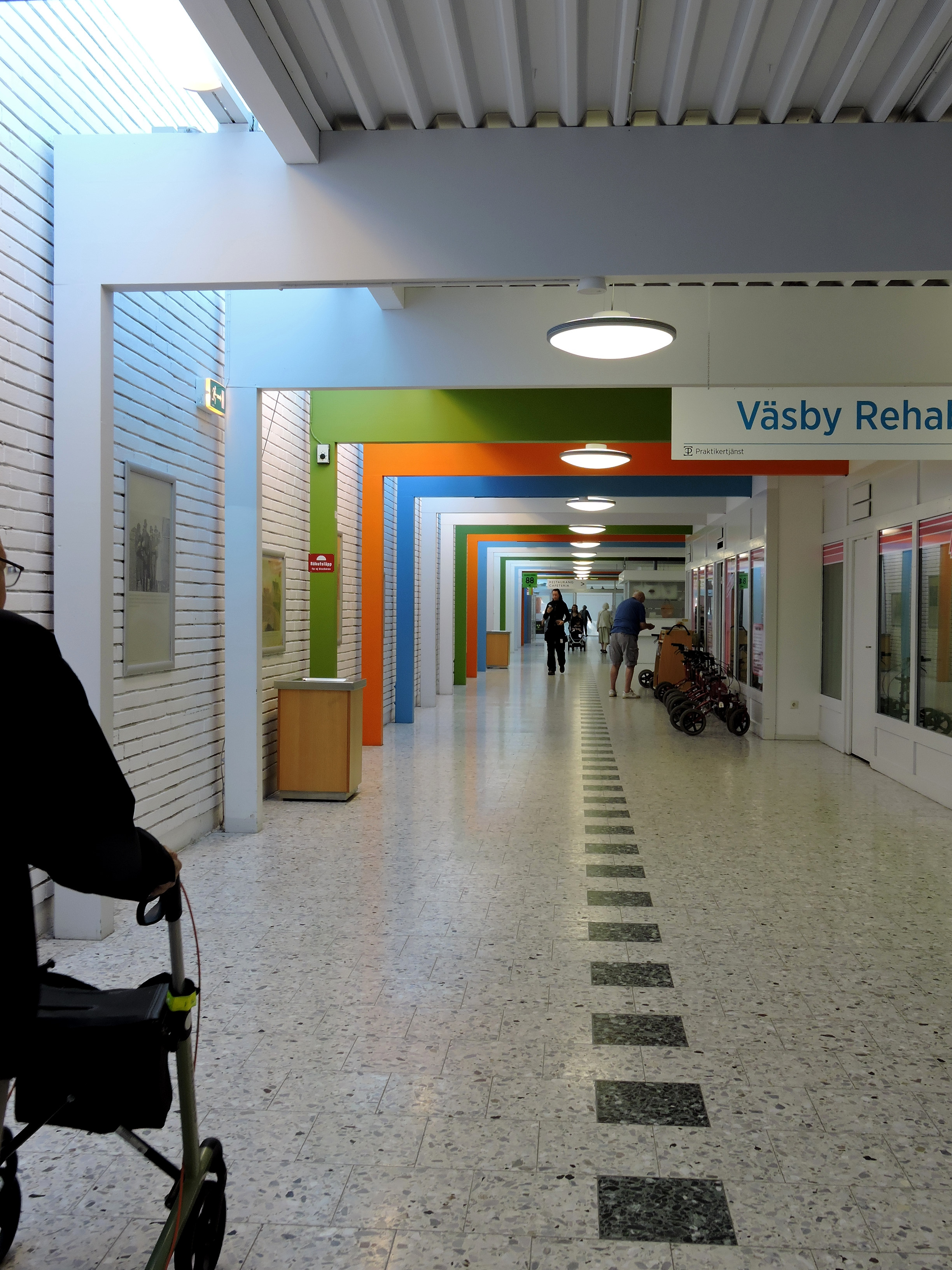 Inte heller i den långa korridoren utanför äldreboendena finns någon soffa kvar och väntar man på någon utanför rehab så får man stå.