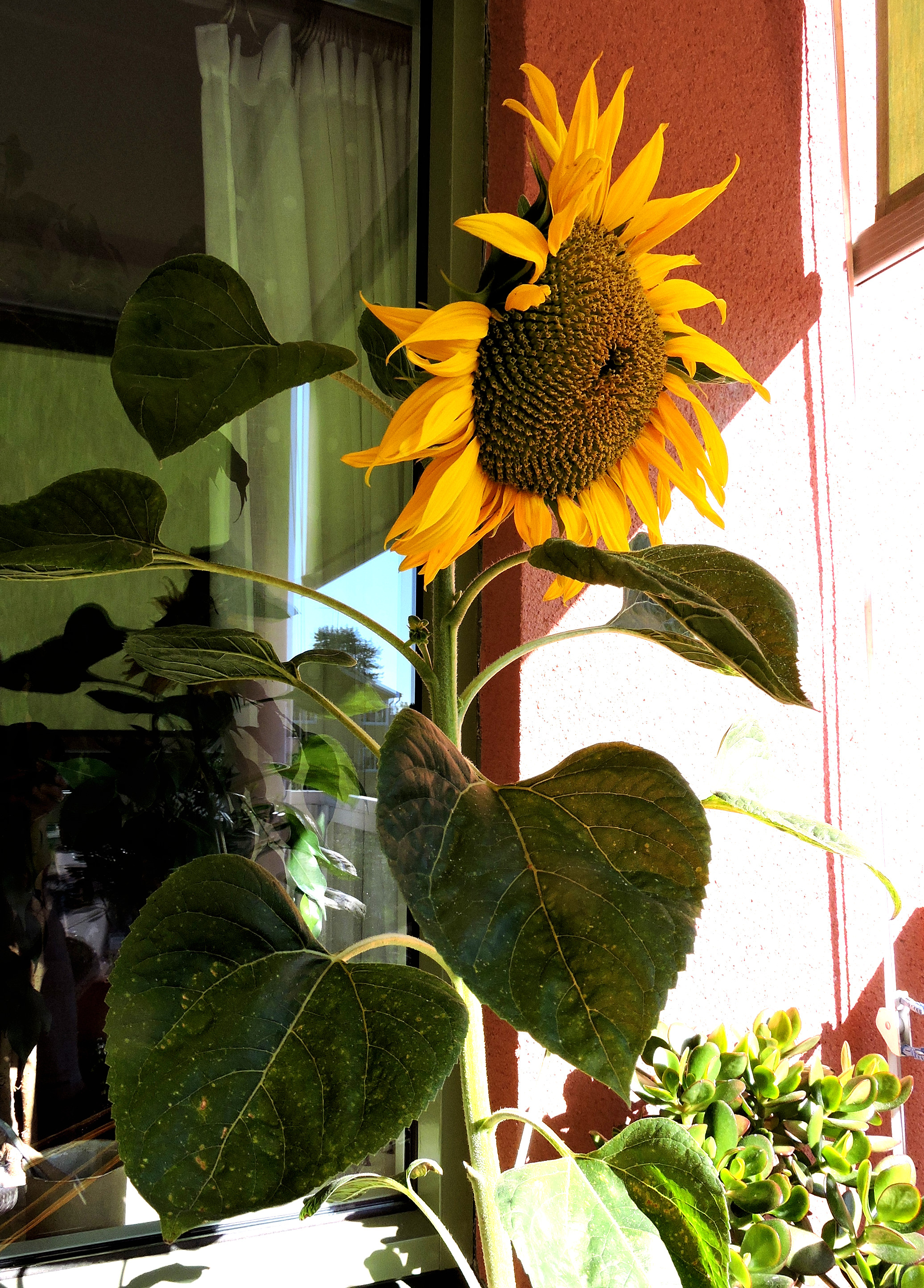 I våras grodde några frön i en balkonglåda, som jag inte hade lagt dit. De var lite kraftiga och sträva och jag förstod att de ville bli solrosor. Fröna hade blåmesarna sprätt om kring, när de hackade på talgbollen jag hängt upp på balkongen. Så småningom flyttade jag över plantorna i en kruka utan växter och de fick klara sej på ingen tillsyn alls. De gav inte upp och nu i augusti slog blommorna ut, en liten och utsvulten, en mittemellan och en i rätt bra storlek.