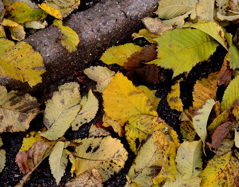 I dag hade löven rasat av träden och lagt sig på asfalten och jag hade bråttom så jag rusade förbi lönnlöven, men då jag kom till ett ställe där stora almlöv seglade till marken, kunde jag inte låta bli att fiska upp kameran.