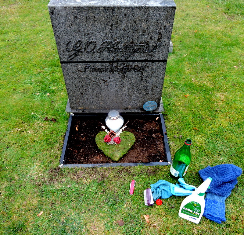 Jag var tidig ute för att få skrubba stenen utan uppmärksamhet. Antilavsprejen från i vintras hade verkat och det gick att borsta bort mycket av påväxten. Flera par kom och tände ljus alldeles intill och när jag tittade upp för att hälsa, var de redan borta. På Vetlanda kyrkogård försvinner folk. Då jag var nästan färdig och hade tänt ljuset började klockorna i kyrkan att ringa, det var märkligt.