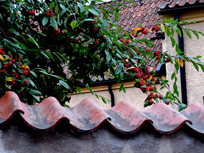 Vi prövade i år att bo i en annan del av stan, just ovanför DBV:s trädgård. Det visade sig vara ett originellt ställe, en grupp hus kring en gård där Clematisen blommade för fullt och marken var beströdd av svartaktiga klumpar.