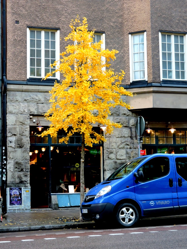 Vi kom från Västerbron och svängde in på Hornsgatan och mycket riktigt, bladen var borta. Ett och annat träd lyste gult men då vi kom upp mot mer skyddade delar av gatan och något äldre träd såg vi vad som skulle kunna bli lika märkvärdigt om hösten som körsbärsträden i Kungsträdgården om våren. Gula eldslågor i rad på flera delar av gatan.