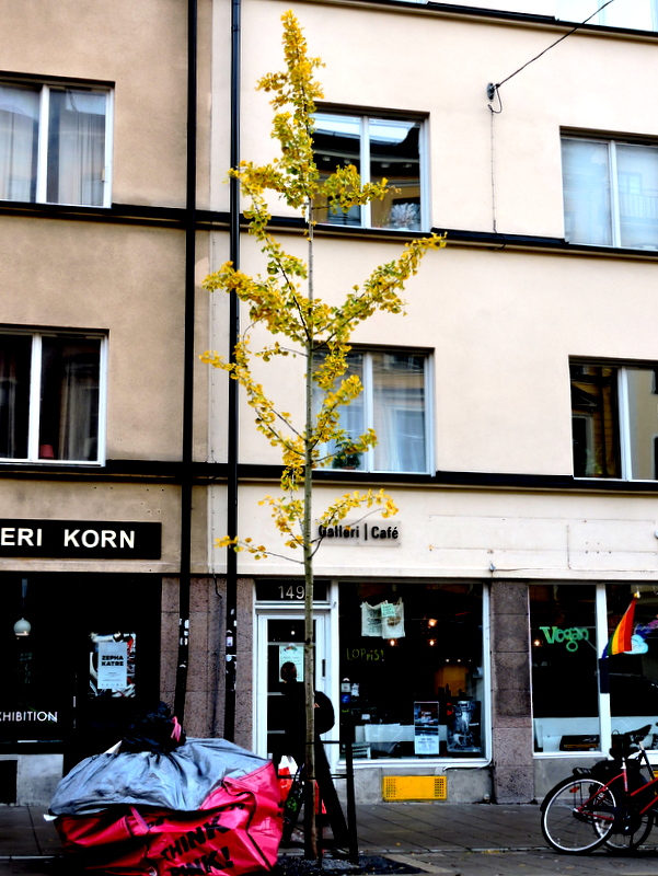 Efter att ha sett Ginkgoträdet i Visby med sina lysande guldblad förstod jag att jag det kanske var försent att se hur Hornsgatans alla 200 träd såg ut just innan löven (barren) föll. 2 km gata med träd på båda sidor började planteras hösten 2010 och de senaste kom i jord hösten 2014. Tänk om alla gulnar samtidigt, de måste ju lysa som facklor men jag har inte läst något om dem, vi måste åka dit och kolla. Söder är nog lite kallare än Visby så de har nog redan fällt sina blad.