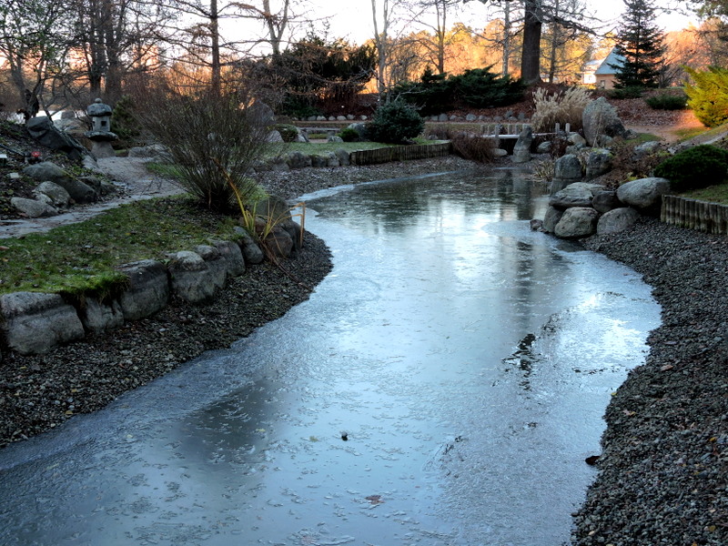 Det har varit kallt i natt och marken är vit av frost, där solen inte kommit åt. Den står lågt och området kring Japanska dammen ligger i skugga. Vattnet har frusit, det är svinkallt och det lockar inte att dröja kvar i skuggriket.