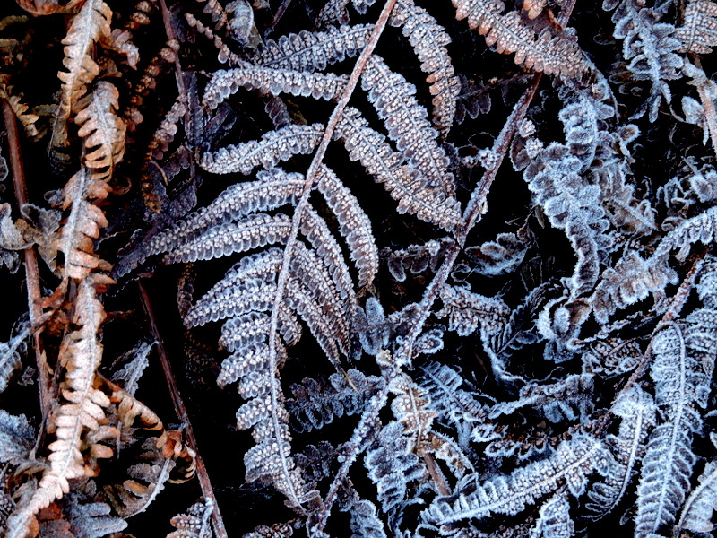 Ormbunkarna hänger sorgliga och mörkbruna utmed bergsidan men med frost på blir de genast sevärda.