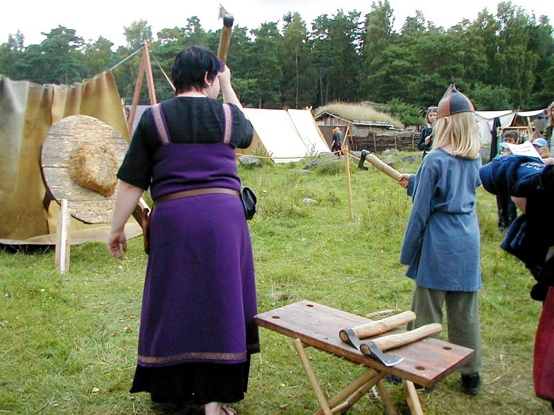 Alltså – vikingatida höstmarknad på Gunnes gård i början av september. Vädret var inte det bästa, men de som sålde något hade tält över sig. Vikingatid och Medeltid har sina fans och de syr och tillverkar plagg och föremål inspirerade av fynd från tiden och som ligger ute i muséerna. Sen klär man sej omsorgsfullt i det man tillverkat och som känns riktigt och minglar på marknader för likasinnade. Där finns allt, smidda föremål, läderarbeten, smycken, tyger och här och där kan man pröva pilbågeskjutning eller yxkastning. Gunnes gård är fin att duka upp all vikingarekvisita på bland husrekonstruktionerna och den grå luften var parfymerad av vedbrand.