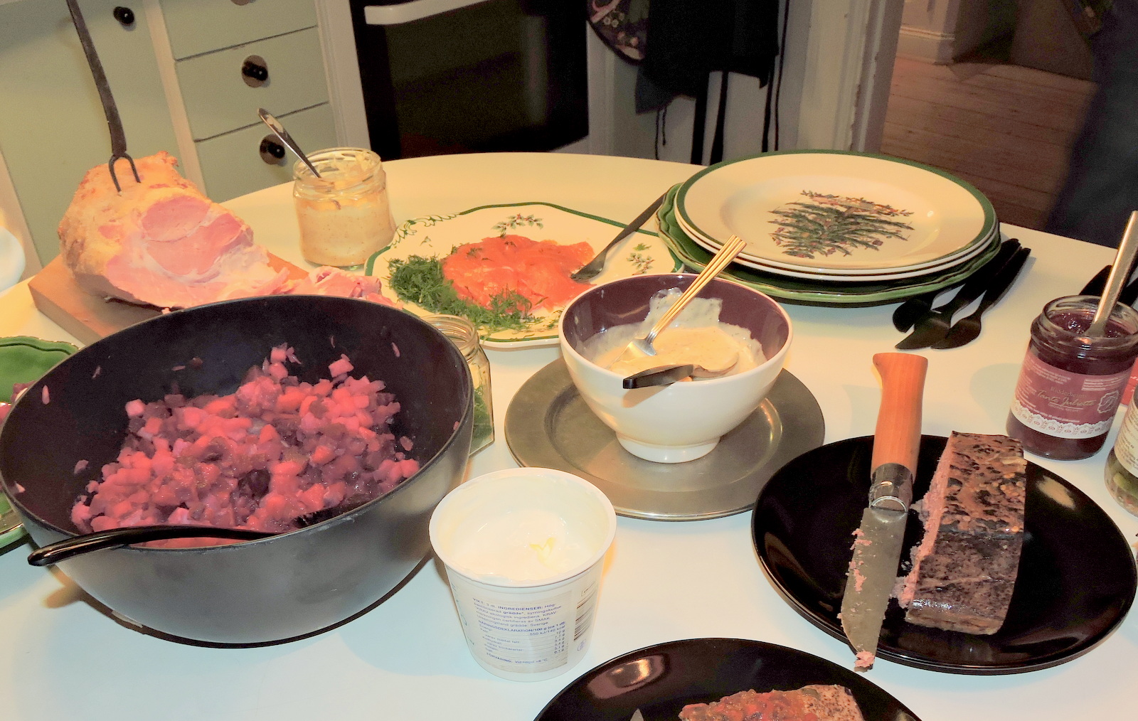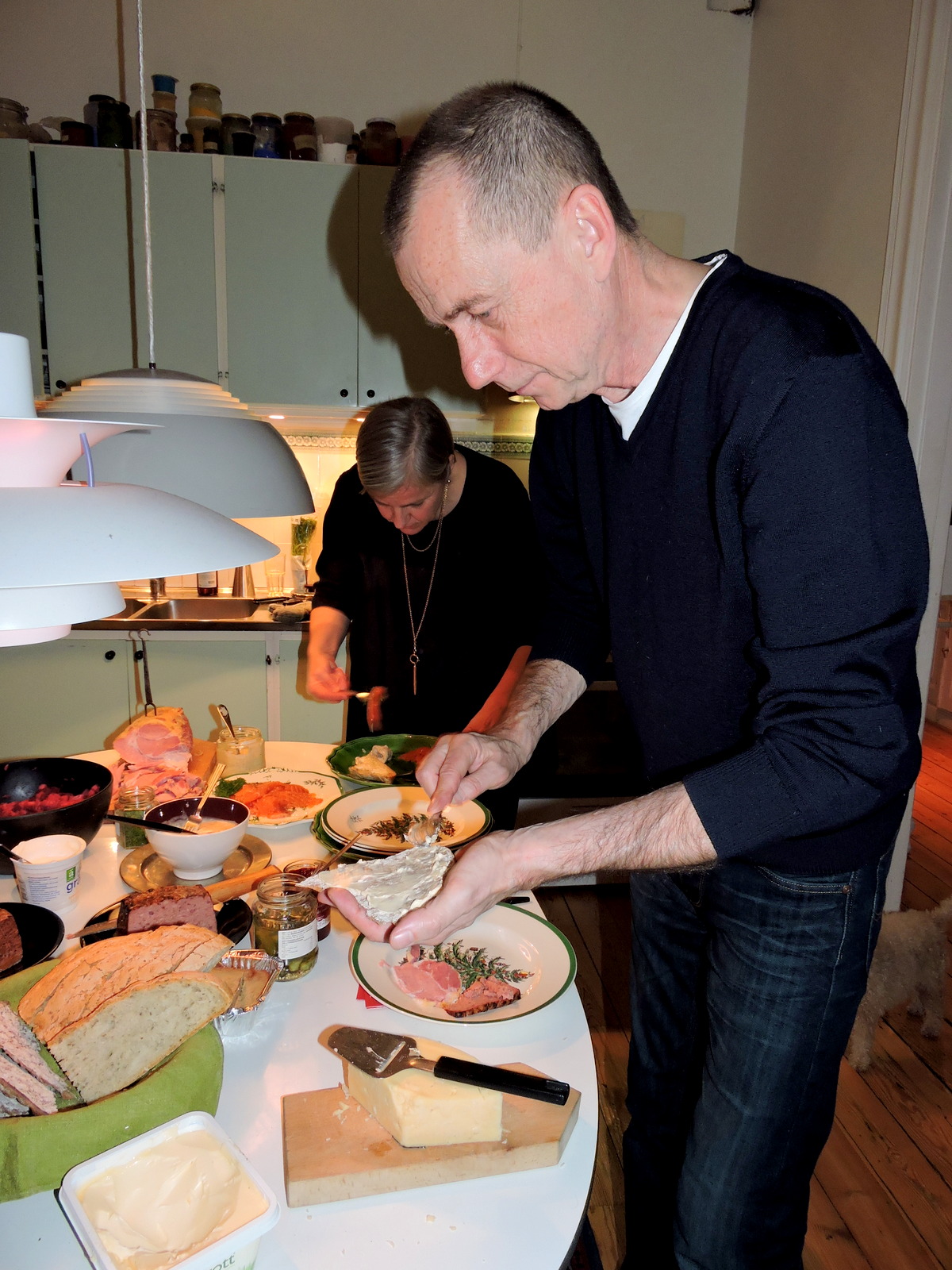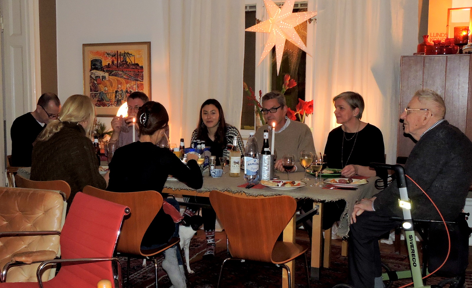 Sen for vi till Södertälje och fick glädjen att vara tillsammans med våra vuxna barn och ett vuxet barnbarn hos Karin och Glenn och alla hade med sig något de inte kunde undvara på julbordet. 1-DSCN5615Det blev alltså potatisgratäng (på spisen), sillsallad, skinka och gravad lax och vi  gamlingar kunde smita från disken.