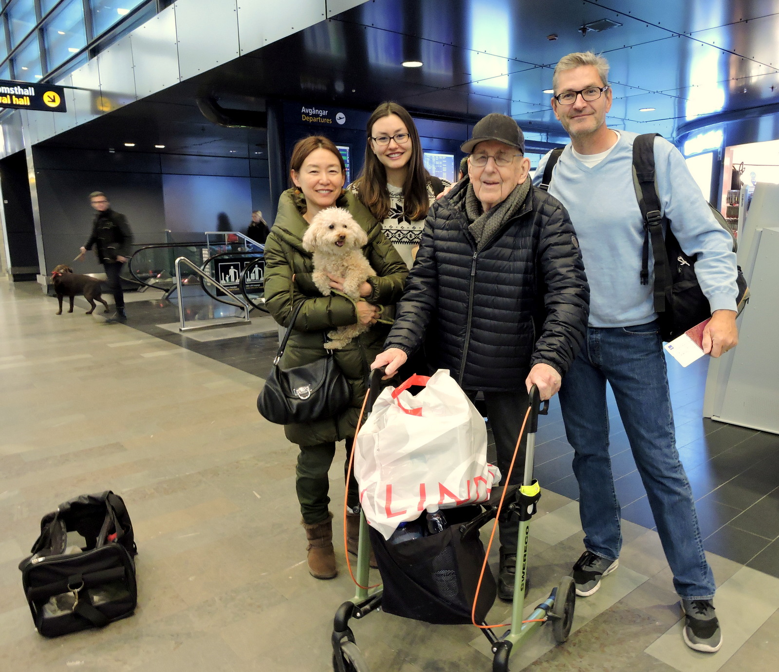 Oj, det ska många papper till för att få ta hunden med och veterinärbesiktning strax innan resan ska göras både hos oss och i Japan. Nu är vi i ett s.k. rabiesfritt land och det underlättar men minsta glömska med de rätta papprena innebär katastrof. Sen om hunden väger under visst antal kilo, får den följa med i låda bland passagerare men är den större blir det låda i lastrummet och där kan bli lika kallt som utanför planet.