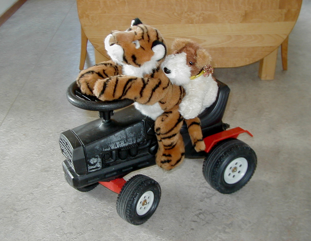 Selinas käraste tiger Henrietta och en hund jag inte hållit reda på namnet på. Traktorn kom till för att Erik skulle ha något att greja med när han var riktigt liten, men det blev Selina som kom att köra den allramest.