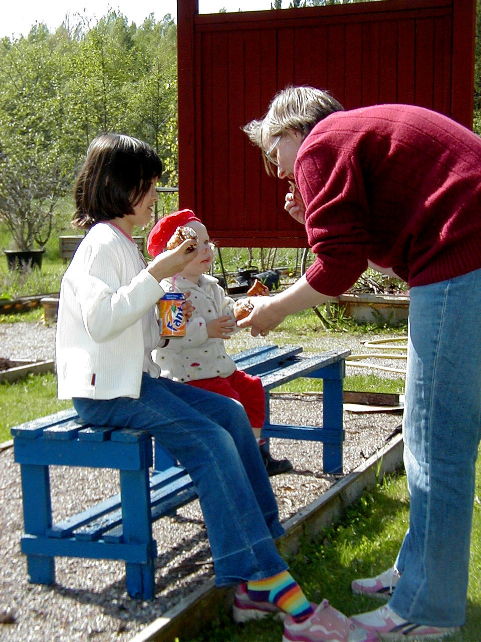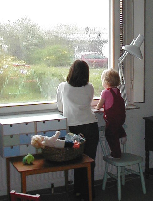 Selina och Alexandra väntar på att det ska sluta regna så vi kan gå ut och gå till ”trädgårdarna” och fika.