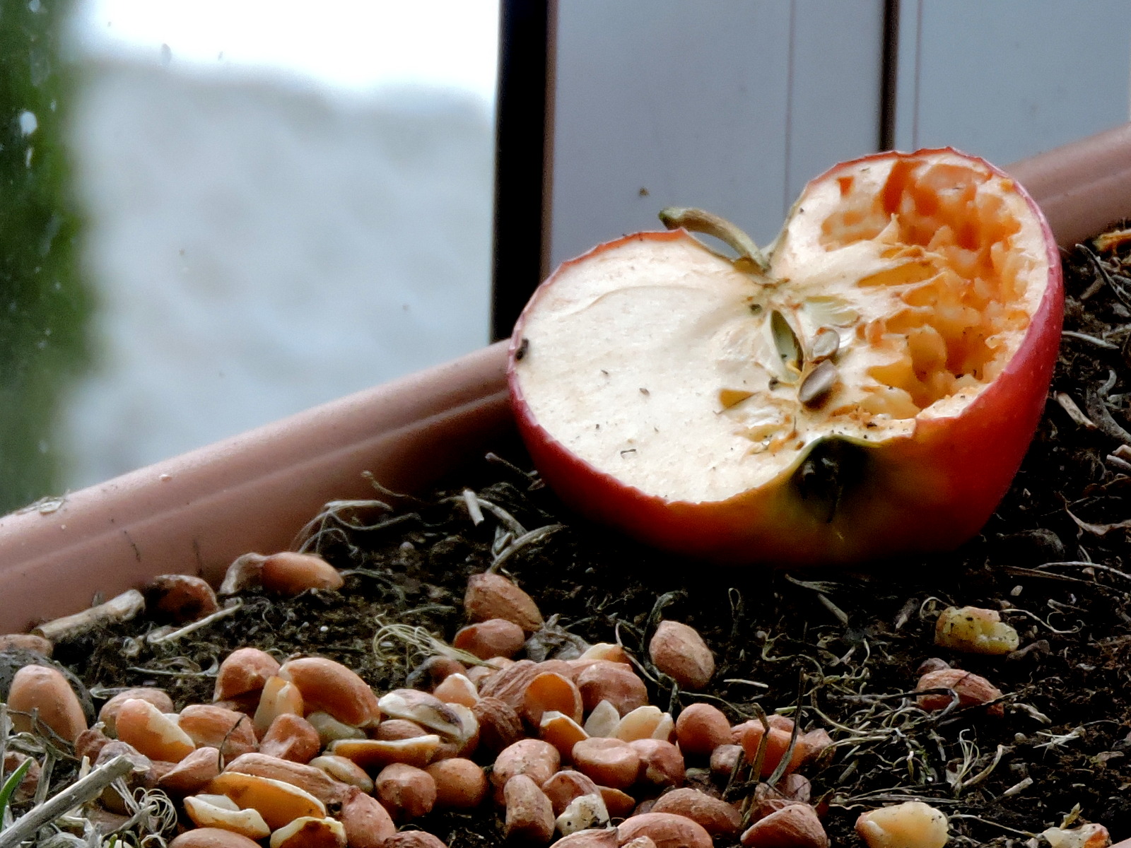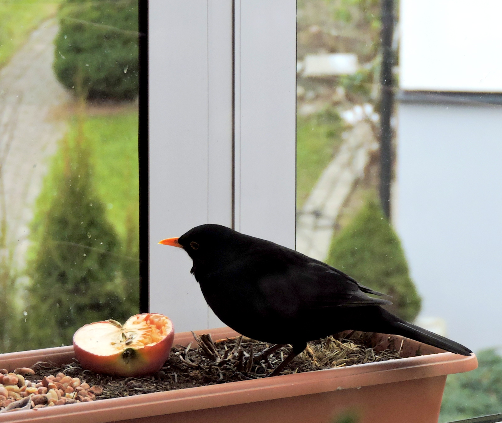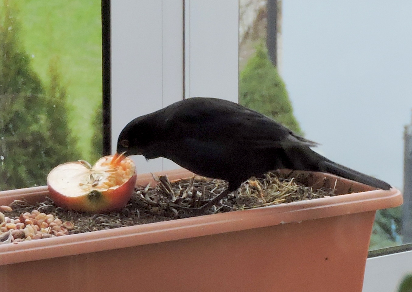 På försök la jag ut jordnötter och ett ituskuret äpple. Har jag otur så kommer kajorna och kalasar eller skatorna, men de verkar ha fullt sjå med att veckla ut paket och påsar i villasoptunnorna. En förmiddag hörde jag ett lite mildare kraxande och kikade ut, det var en koltrast som satt och hade ljud för sig, det lät som han sa till flera att han hittat något. 1-DSCN6057