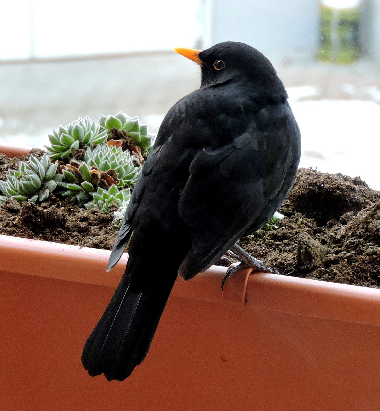 Så här är det. Balkongens räcke har fönsterglas, så vi ser ner till marken genom, men det når bara till midjehöjd som ett vanligt balkongräcke. Sen har jag tagit bilden inifrån rummet, för så fort jag kommer nära dörren så är fåglarna väck. Det blir alltså kamera – fönster – fågel – glas – grannskap.