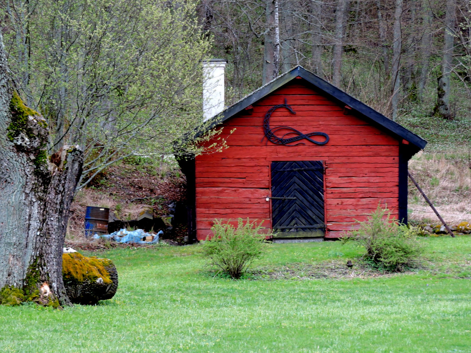 Vi har aldrig gått runt i den här parken, så det fanns mängder att se. En skylt visar vägen till en smedja och vi gissar att det är det ensamma röda huset en bit bort från bebyggelsen. Om den skulle ta eld…..