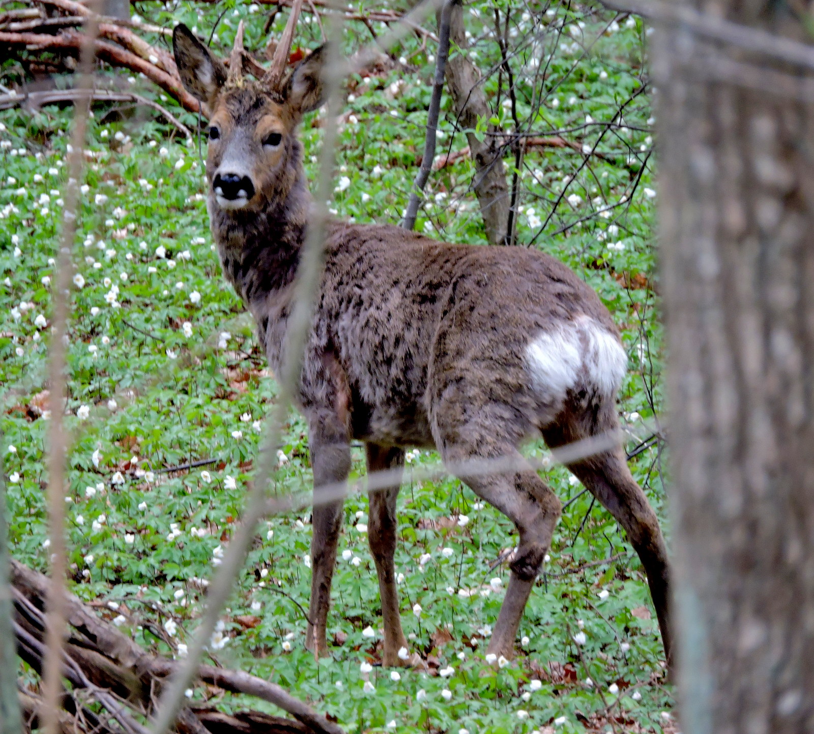 Tre rådjur med toviga pälsar strosade kring bland vitsipporna som inte öppnade sig idag.