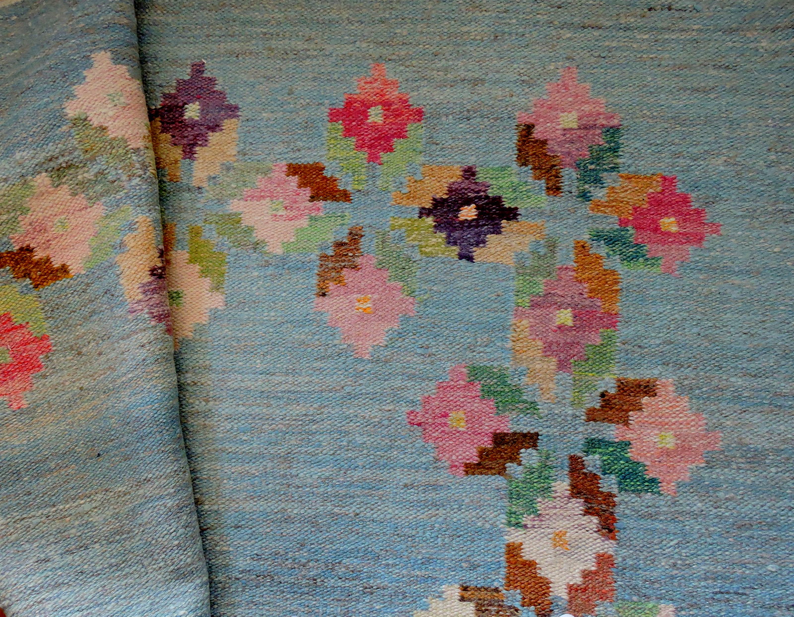 Stjärnorna ville sen vara med och jag vävde en matta med handspunnet garn i två enmetersbreda längder där de åttabladiga fick bli mer blomlika i färgerna. Denna matta är nu efter 40 år ordentligt blekt och nersliten och börjar bli behaglig att se på och att ha under fötterna.