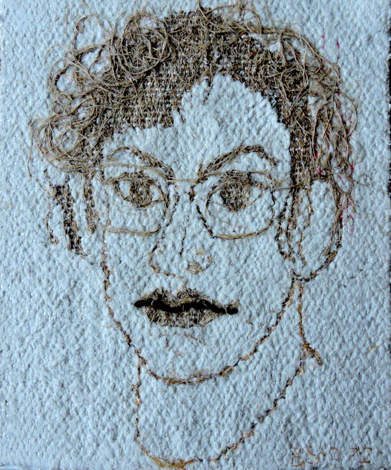 Garnet kom inte genast till användning och blev liggande i flera år tills det blev 70-tal. Jag hade gjort Niklas porträtt i gips och ville försöka med Gösta och Karin också, men barnen var aldrig stilla och orkade inte sitta modell och jag orkade inte heller, så det fick bli något enklare. Då vävde jag in Gösta med nässelgarn i en asbestbakgrund. Mesta delen av garnet gick då åt.