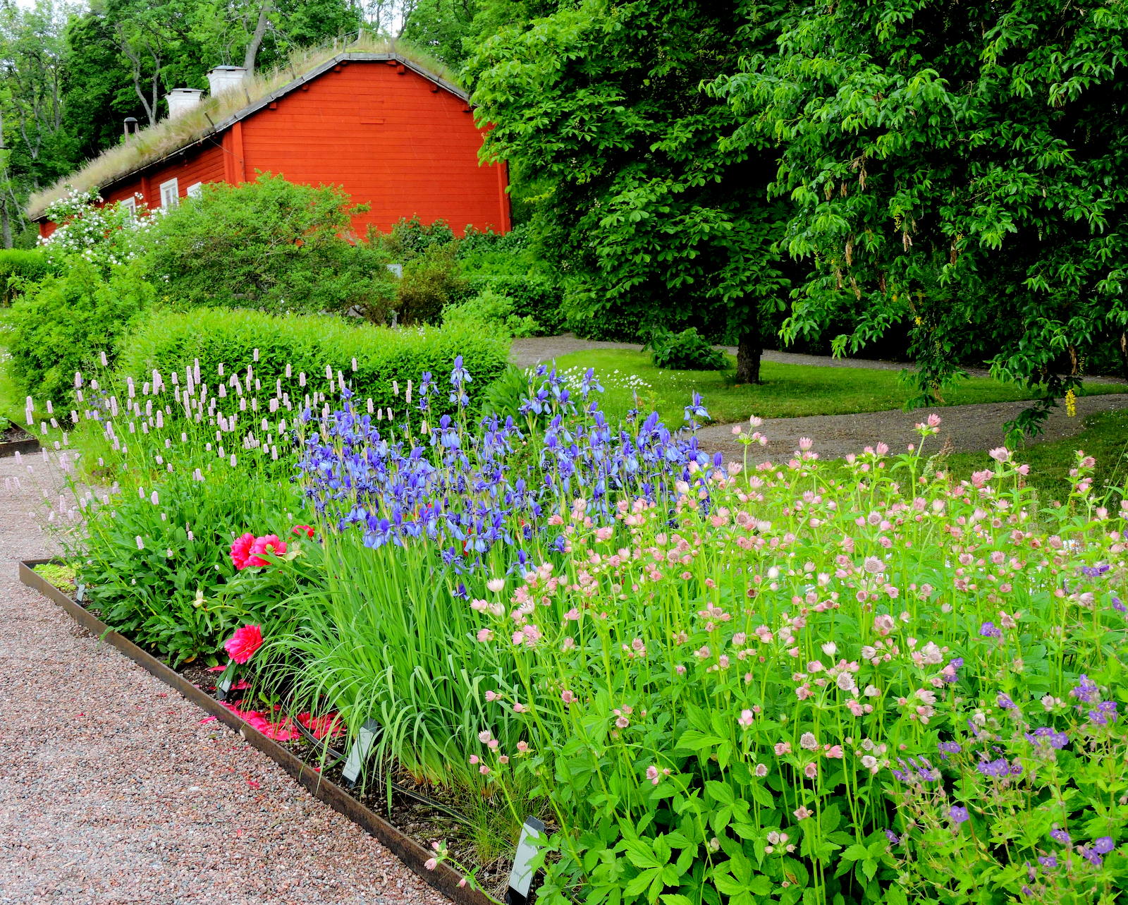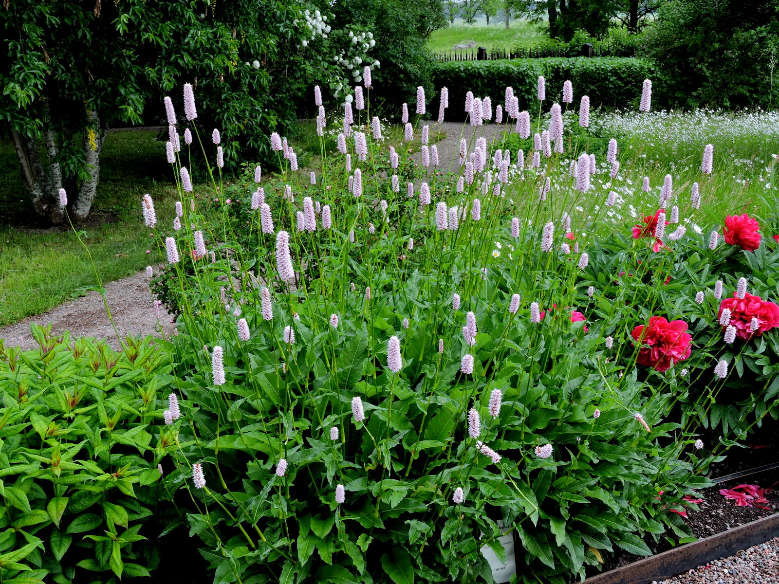 Växterna i de gamla rabatterna var enormt frodiga, här stod Mose brinnande buske både en vit och en rosa i full blom.