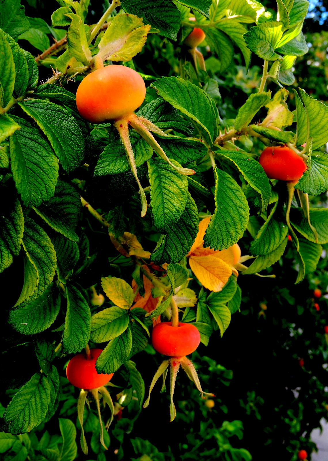Grannens rosenhäck doftar av enstaka rosor fortfarande, men nu börjar nyponen bli röda.