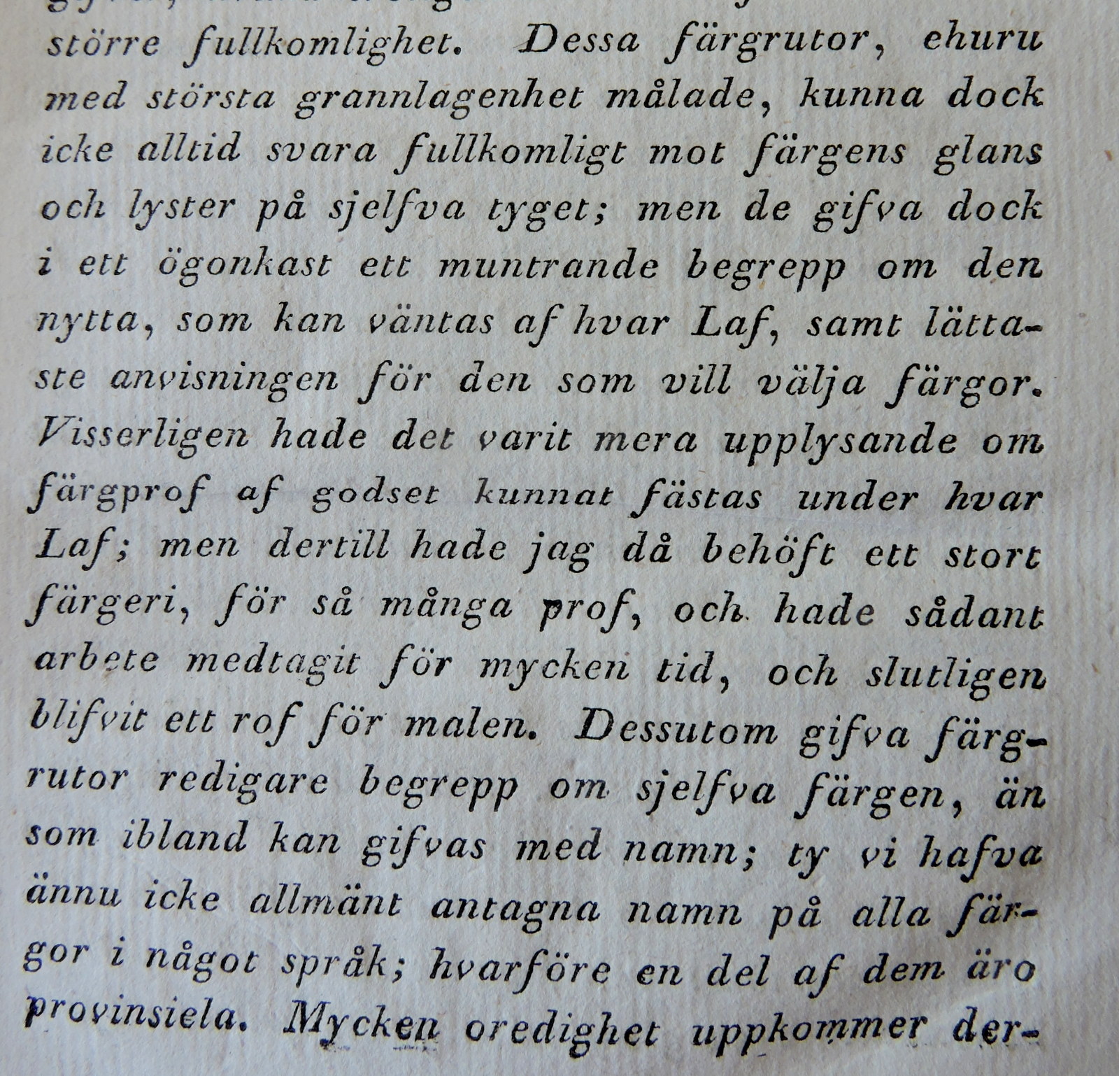 Jag ringde runt till Stockholms antikvariat för att hitta originalet till recepten och boken där receptet hämtats, Svenska lafvarnas färghistoria var känd men kom mycket sällan in till försäljning. Några månader efter att jag lagt en beställning ringde en handlare som fått in boken och jag fick en viss tid på mig att bestämma mig. Det var en dyr bok men jag skulle fylla år och det var svårt att inte önska sig den. Lasse som då jobbade delvis inne i stan skulle gå och titta på den och eventuellt hämta den och hans fråga till handlaren när han fått boken i handen, har blivit ett upprepningsskämt i familjen. ”Har ni något bättre exemplar”? Bokhandlaren upplyste då vänligt att det här var det andra exemplaret han sett under hela sitt gråhåriga liv och han trodde att det möjligen fanns sammanlagt fyra. Om det inte passade, så hade Lasse inte förstått något.