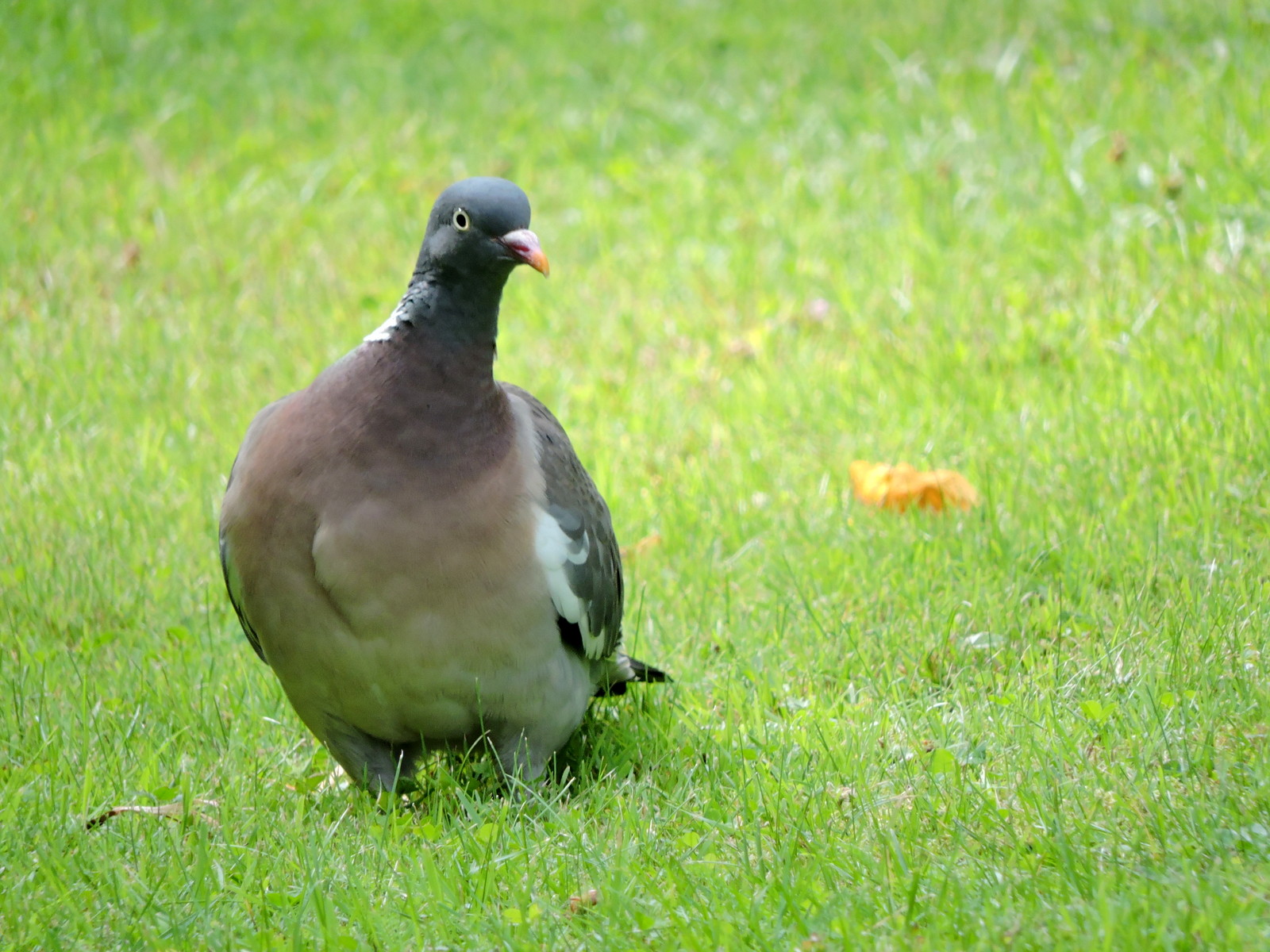 En ringduva står plötsligt i gräset och visar sig från alla sidor och går sedan upp i en av de unga lindarna.