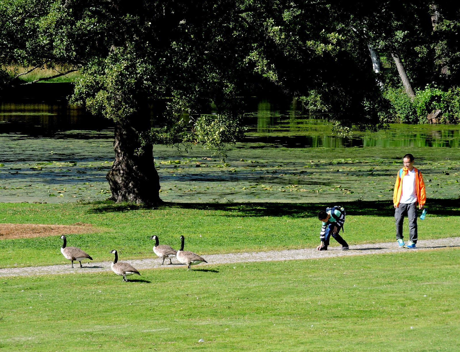 Den stora fria ytan i parken med dammar och fåglar var också väl besökt. Pojkens rörelse på bilden är något som (en del) djur lärt sig att fly undan från, att hämta upp en sten att kasta. Vi lärde oss i Skottland, där lösa hundar drog kring i flockar att om man vände sig mot dem och tog upp en sten från marken, så flydde de utan att man ens behövde kasta den.