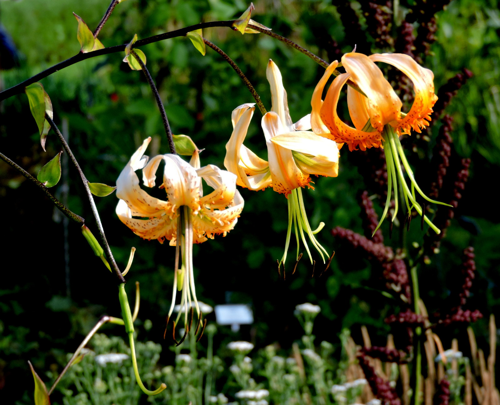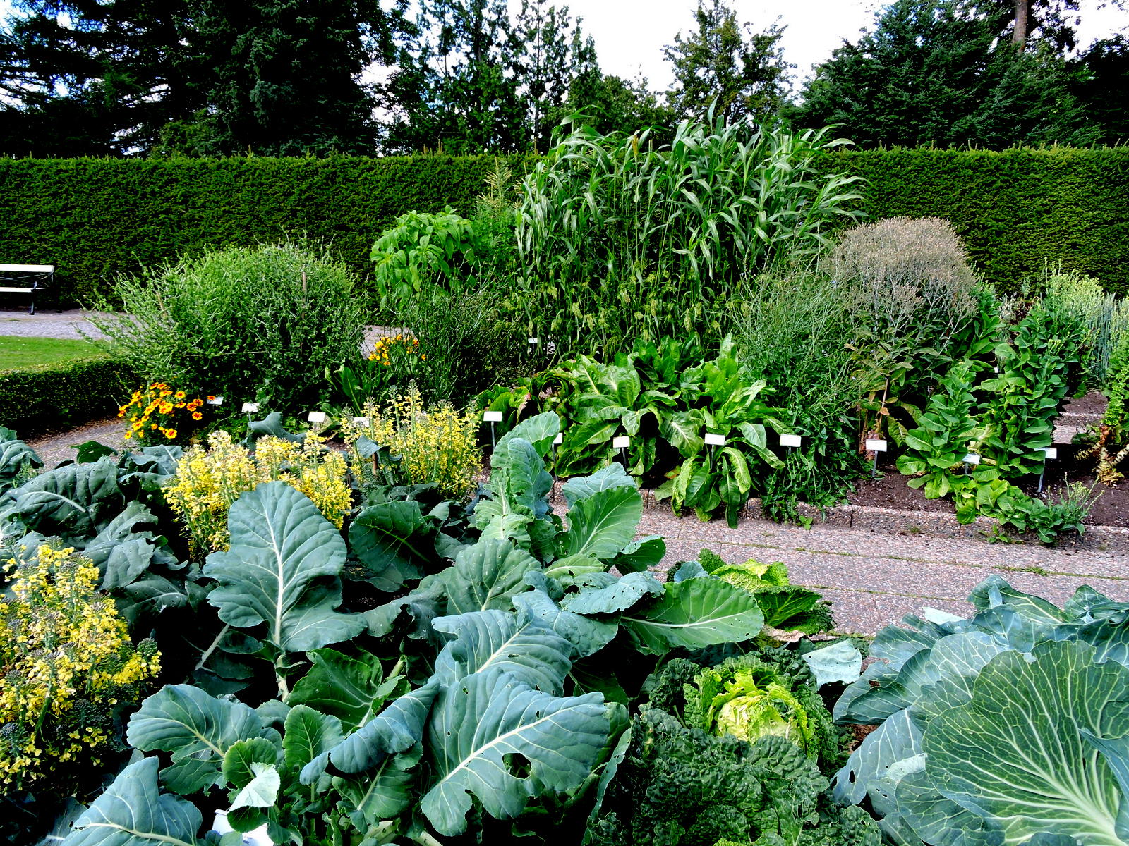 Våren i Bergianska med alla blommande träd är oemotståndlig men det är alla de följande årstiderna också. Nu är det fullt överallt, höga och låga växter fyller växtrutorna och alla ser ut att ha utvecklats maximalt. Något som imponerar den här årstiden är avdelningen innanför granhäcken med kålväxter och andra ätbara eller användbara nyttigheter.