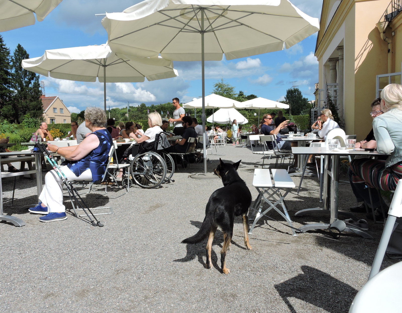 Här vaktar en gråsparv på vad som faller från borden. Det gamla orangeriets café är en fristad för hundägare som också vill ha en kopp kaffe. Innan man skaffat hund vet man inte hur svårt det är att hitta ett ställe där man är välkommen med bästa vännen.