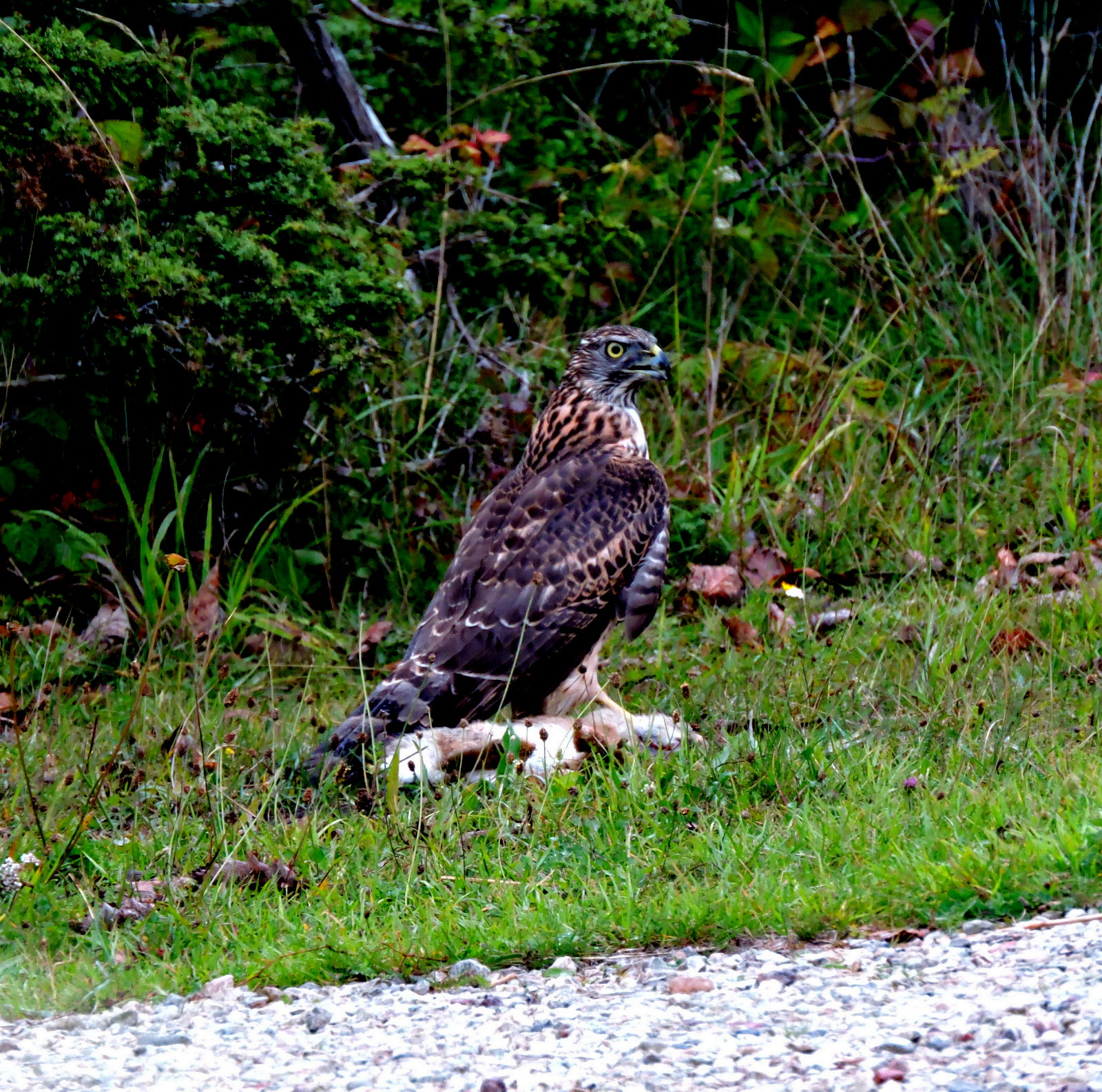Mitt i vägen till Bertelsmässe satt en rovfågel. Jag saktade ner och förstod att den hade anledning att sitta där. Vi närmade oss lite och då försökte den lyfta med sin last, en rejäl vildkanin, den hängde fast i fågelns ena fot och han måste gå ner lite längre fram. En mötande bil visste inte vad vi väntade på och vispade förbi och det störde så fågeln lämnade bytet och flög ensam iväg. Vad är det för fågel?