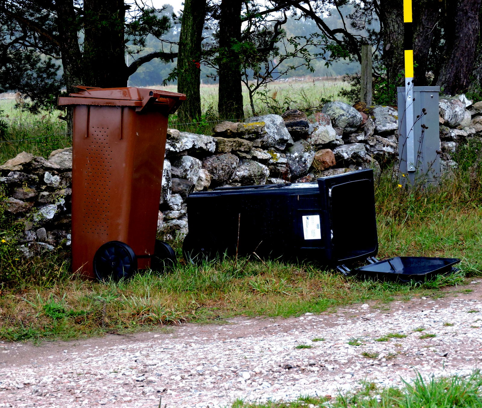 Vi åker och handlar och passerar förutom rönnar med knallröda bär, dikesäppelträd fulla av färgrika frukter, skuttande rabbisar och hus som är bebodda av bofasta eller sommarboende. Alla som bor måste tömma sina sopor i därför avsedda kärl och dessa ska stå så att sopbilen kommer åt att lyfta kärlet, tömma det och ställa ner det igen. Sopsortering påbjuds och i det gröna kärlet läggs torra sopor och i det bruna läggs sådant som kan komposteras. Det komposterbara vägs och vikten kommer med på sopräkningen.