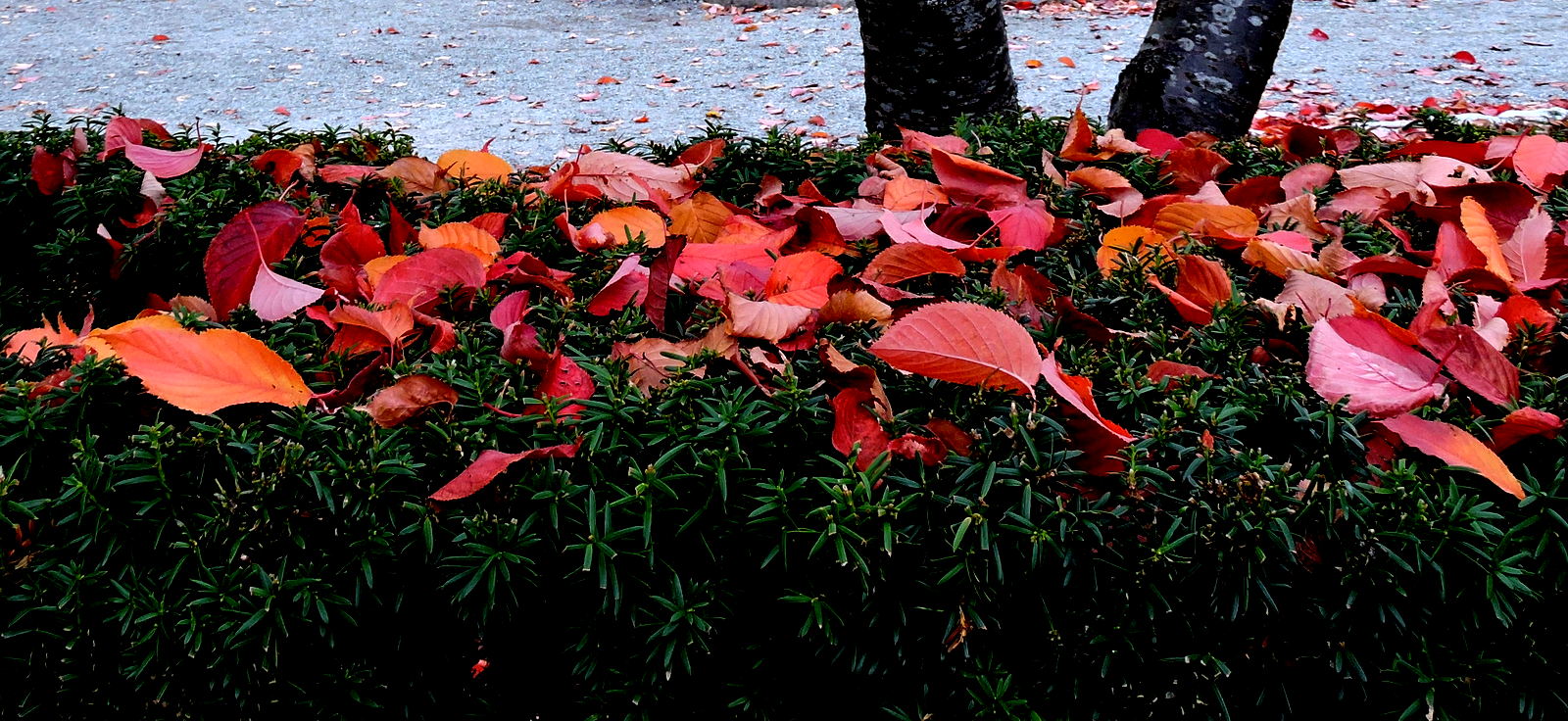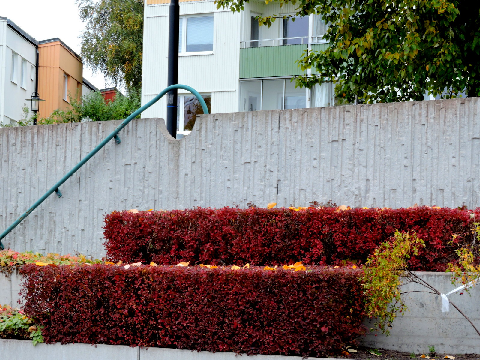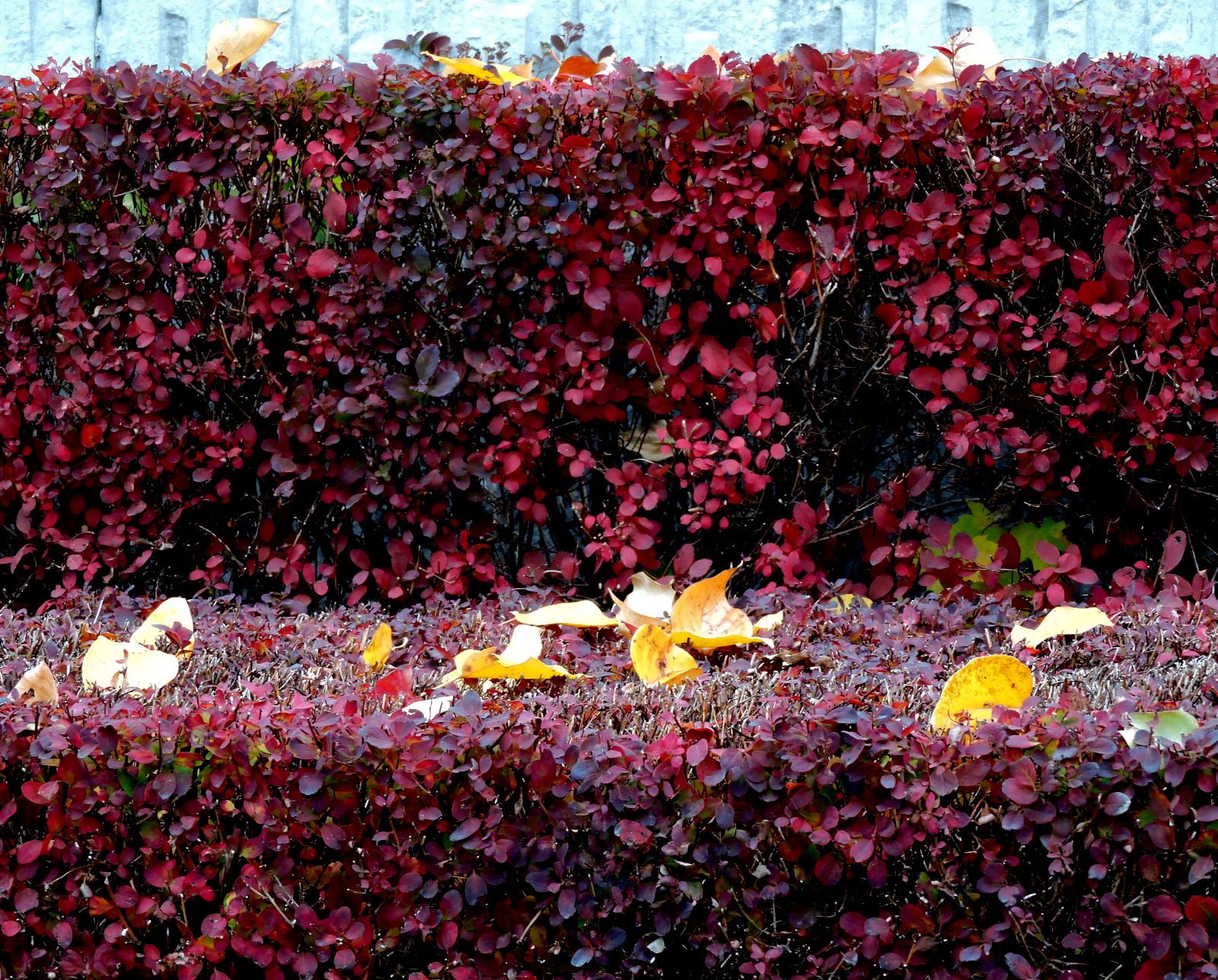 Vi går ner på östra sidan om centrum med de hårt tuktade buskarna, de är nu mörkröda