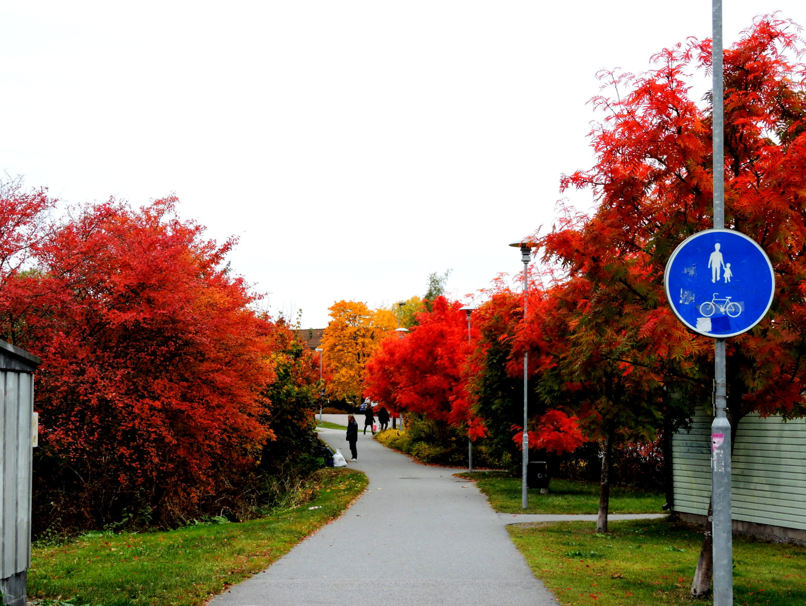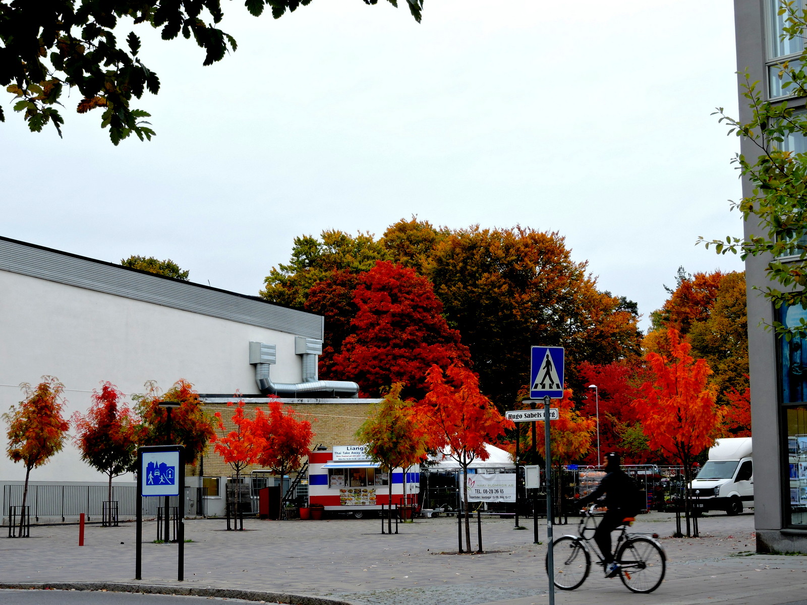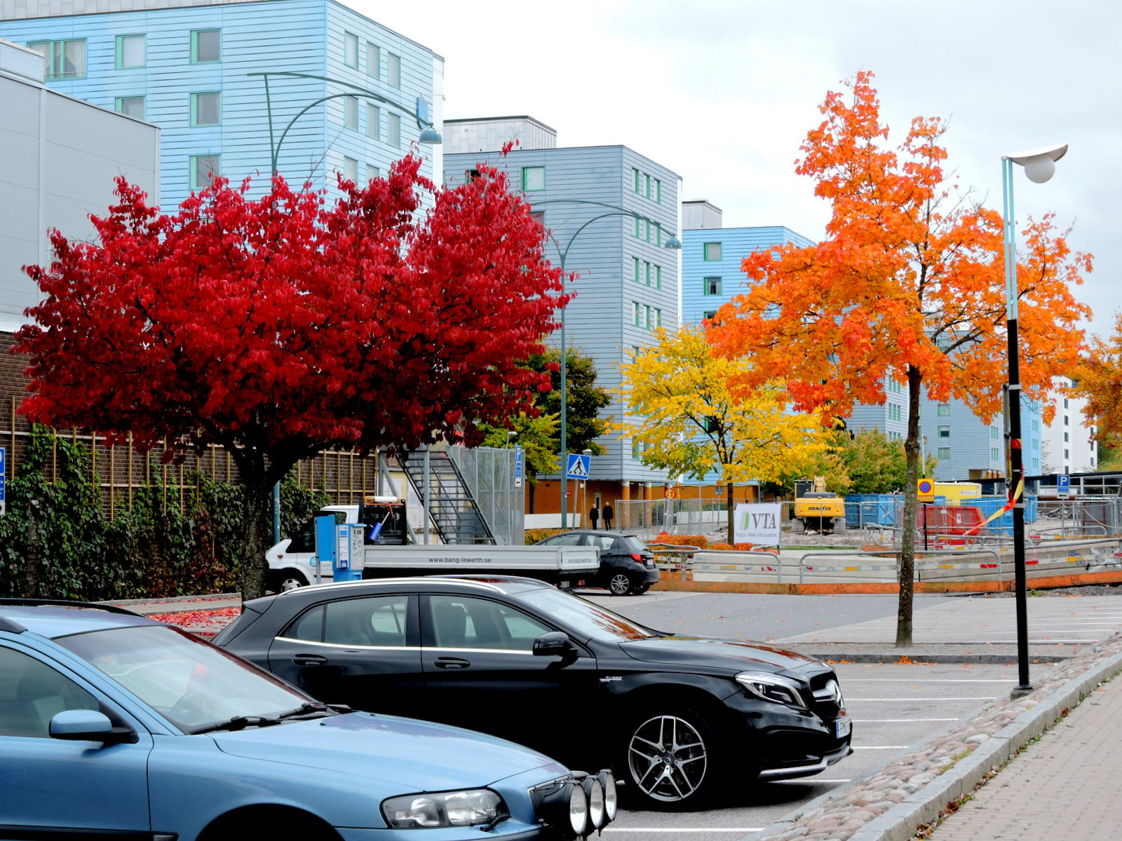och här har de gula bladen från den stora poppeln lagt sig och och blivit synliga. Vi handlar mat, går genom Centrum och på västra sidan möter ännu en färgsensation.