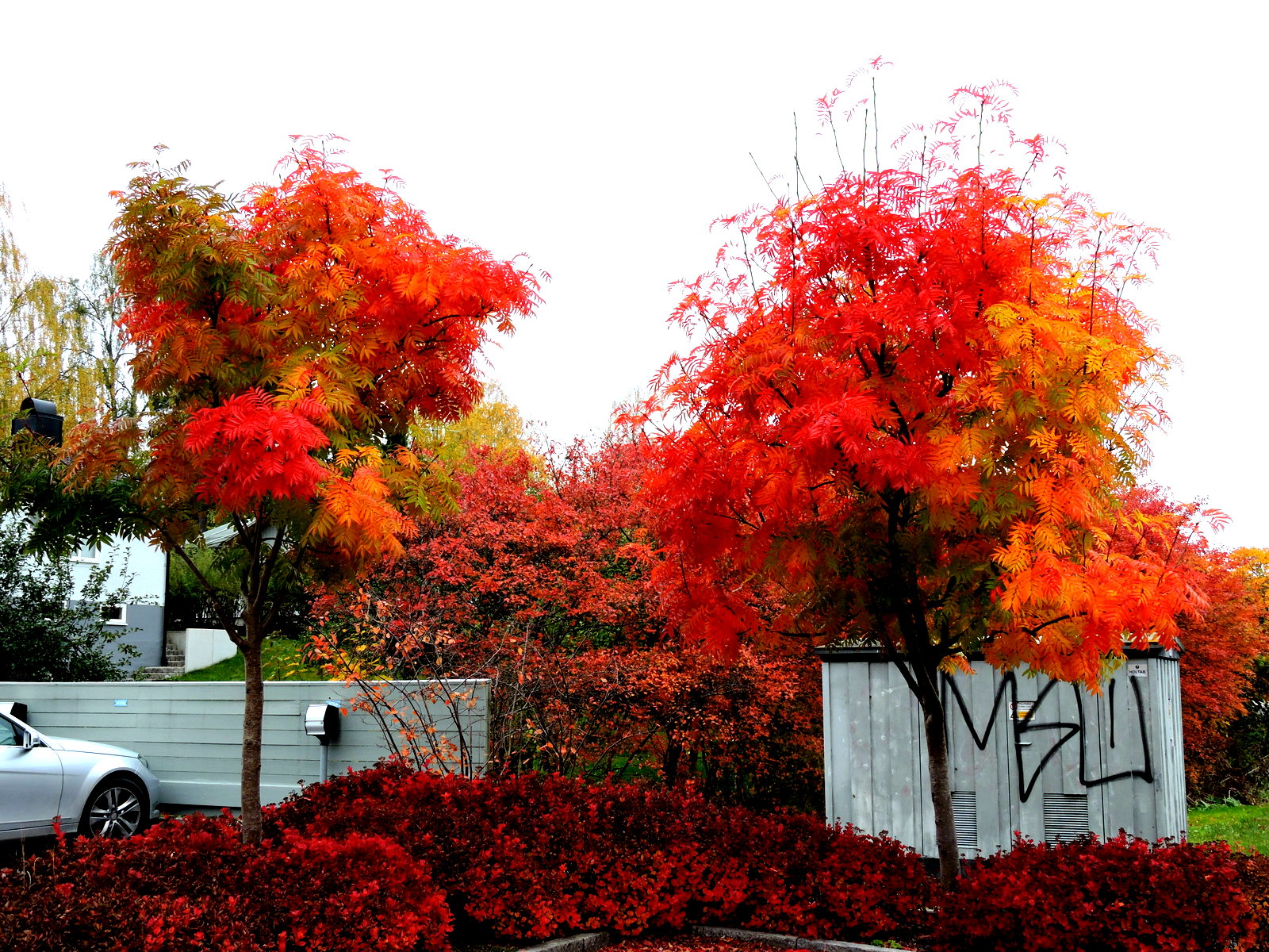 Kallt och ruggigt ute, solen har gömt sej men nu lyser en del träd i färger som man måste stanna upp och beundra. Redan nere på baksidan av huset ser rönnarna ut att stå i brand. Spireahäcken är rödare än någonsin förr.