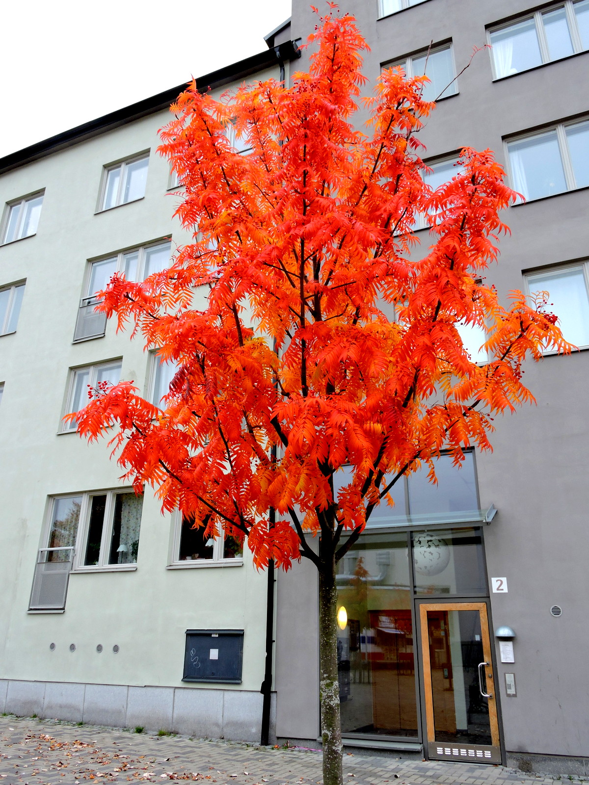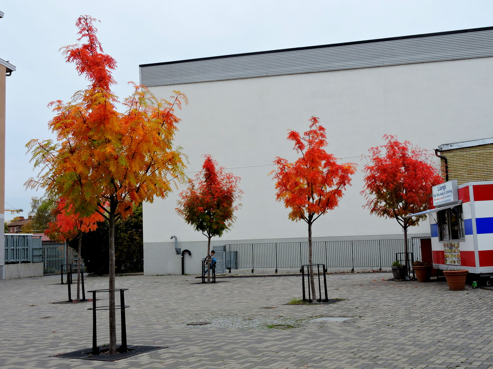 Vi går till Hugo Sabels torg och kollar om de små rönnarna där också har börjat brinna.