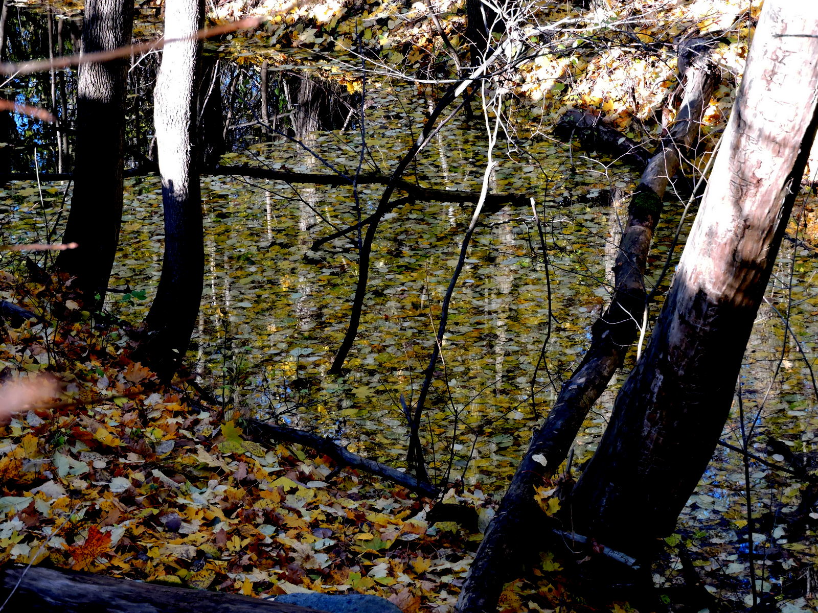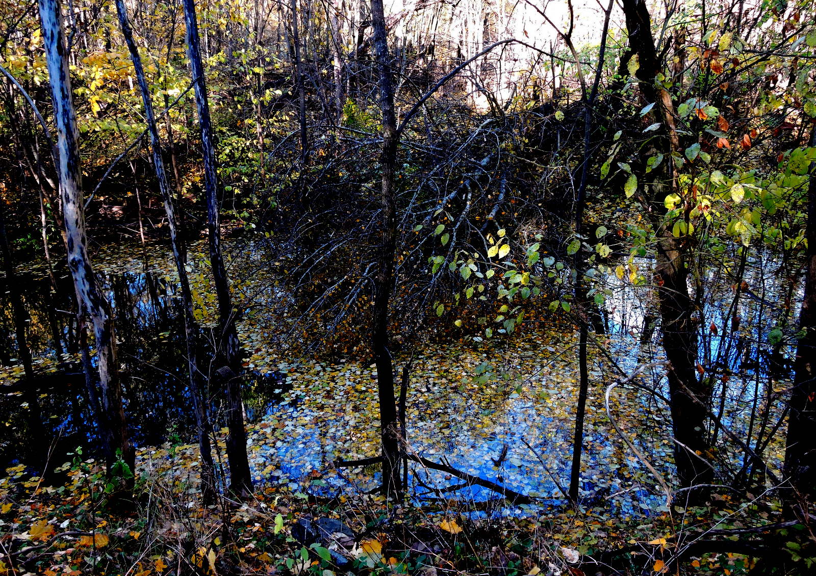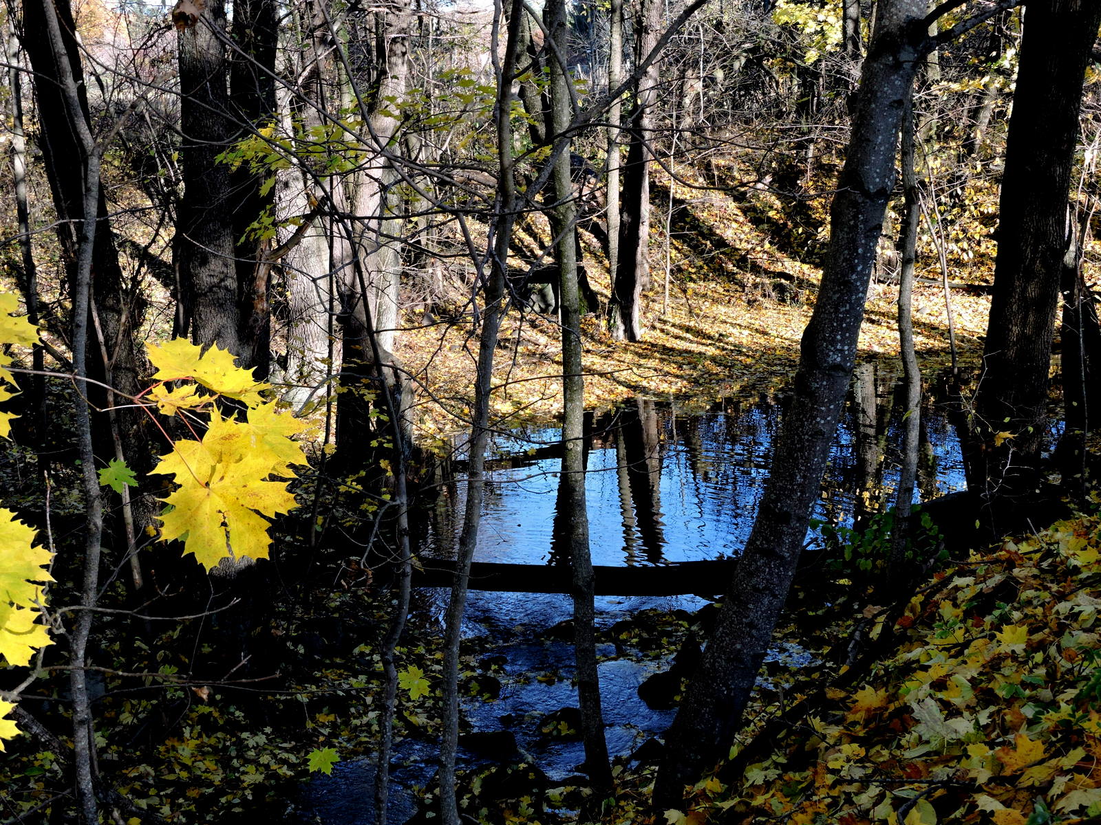 Solen visade sej i går och det var lönnlövens dag, de flesta låg på marken och på vattnet och det var svårt att urskilja vattenytorna från omgivningen. Jag gick in i snåret nära bron där bäcken rinner in under gamla landsvägen och där bussen 502 har sin ändhållplats.