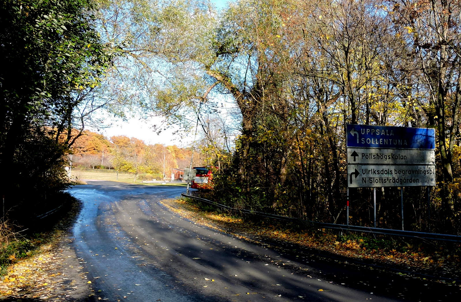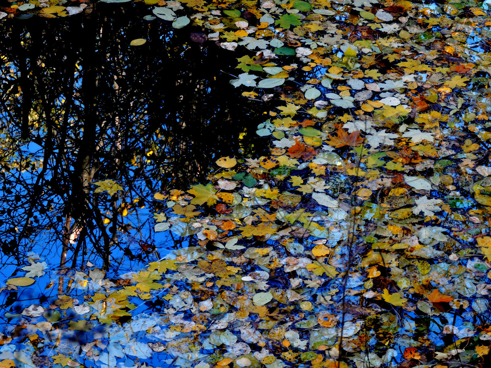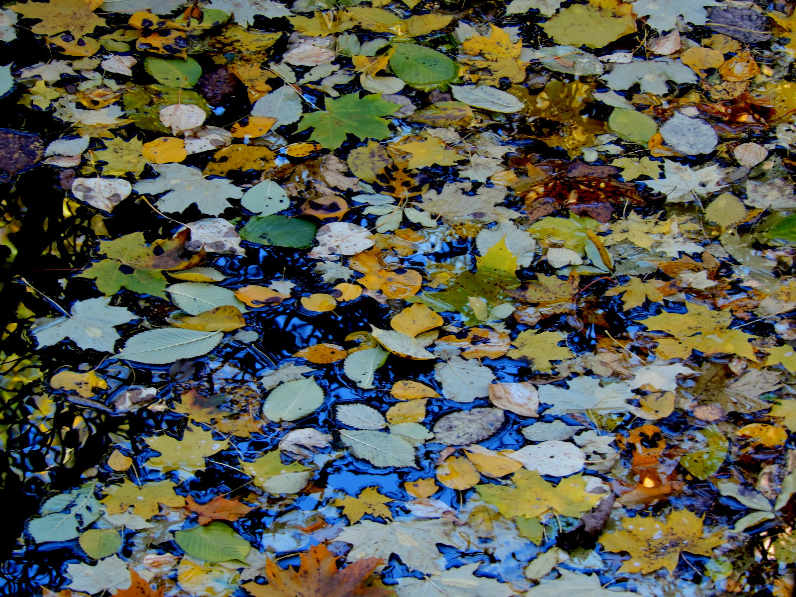 Solen visade sej i går och det var lönnlövens dag, de flesta låg på marken och på vattnet och det var svårt att urskilja vattenytorna från omgivningen. Jag gick in i snåret nära bron där bäcken rinner in under gamla landsvägen och där bussen 502 har sin ändhållplats.
