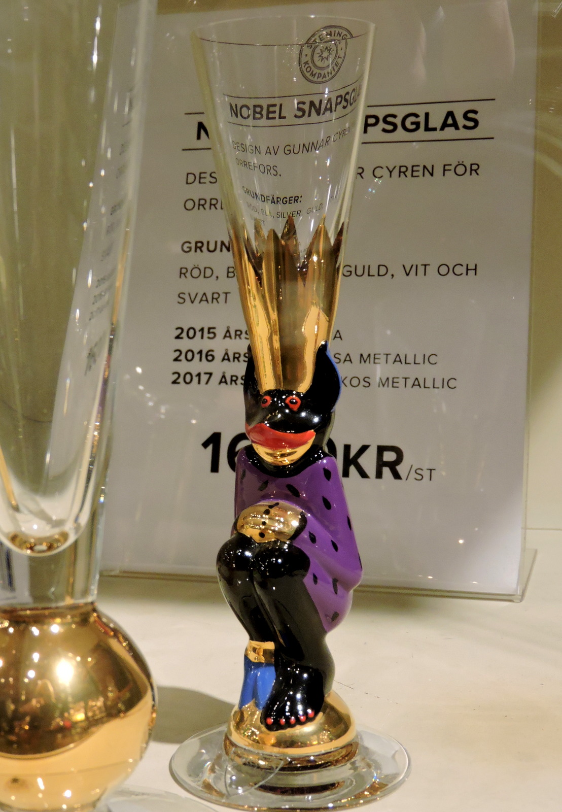 Men vad är det för någon som serverar nubben, bär upp den i sitt hår? En svart någon med tjocka röda läppar och vita tänder, nakna fötter med ljusa naglar. Neej, det är inte möjligt att ett så nydesignat glas kan föreställa något så fullständigt otillåtet som en morian. Titta Lasse, vad tycker du att det liknar? Tyvärr har Lasses enda öppna öga ärr på gula fläcken och han ser allt mycket suddigt och han såg inte ens glaset, än mindre vad det föreställde. Men hur går det ihop med alla internationella gäster, till och med kungen kan ju tvingas att hålla i ett sånt glas och kanske tänka på hovtjänaren Badin. Nej förresten, det serveras nog inte nubbe på Nobelfestligheter – eller gör det? Jag måste se vad det står på nätet om nubbeglaset, någon måste väl ha reagerat.