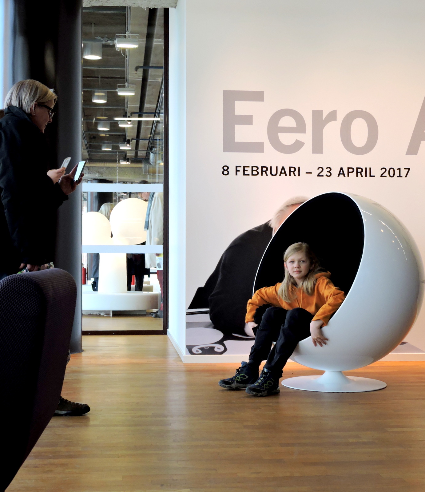 Vi tog oss in i Kulturhuset och 4 trappor upp för en smörgås och sen en trappa till för Åskbollen.  Eero Aarnio är född 1932 och hans stolar var moderna för 50 år sedan, han lever än och här finns en genomgång av hans formgivning. För provsittning  fanns en Åskboll som det tog en stund att köa till.