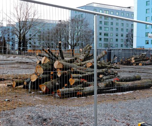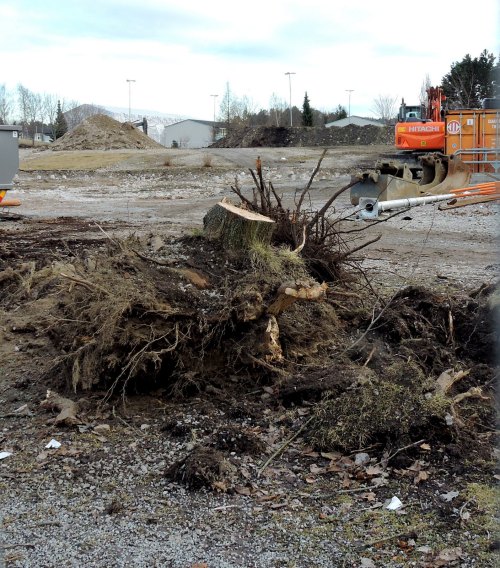 Det är en solig dag sett inifrån och jag känner behov av att röra på mej mer än att gå till brevlådan. Nästan allt söder om vår husrad är nu uppgrävt och likaså det stora området där gymnasieskolan låg. Det har gått rätt många veckor sedan jag kollade vad som sker och något var ordentligt  förändrat. Området var nu inhägnat och bakom galler såg jag roten till ett avsågat fullvuxet träd.