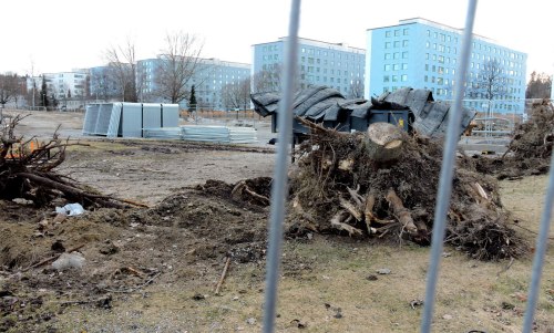 De har tagit ner ett träd aha, men oj där är flera rötter och plötsligt såg jag, de har sågat ner alla lindar som stått i mer än 50 år mellan gymnasiet och centrumhusen. Här ska bli park, men hade man inte kunnat låta träden ingå på något vis i  den nya ”blå” parken? De var definitivt inte sjuka.