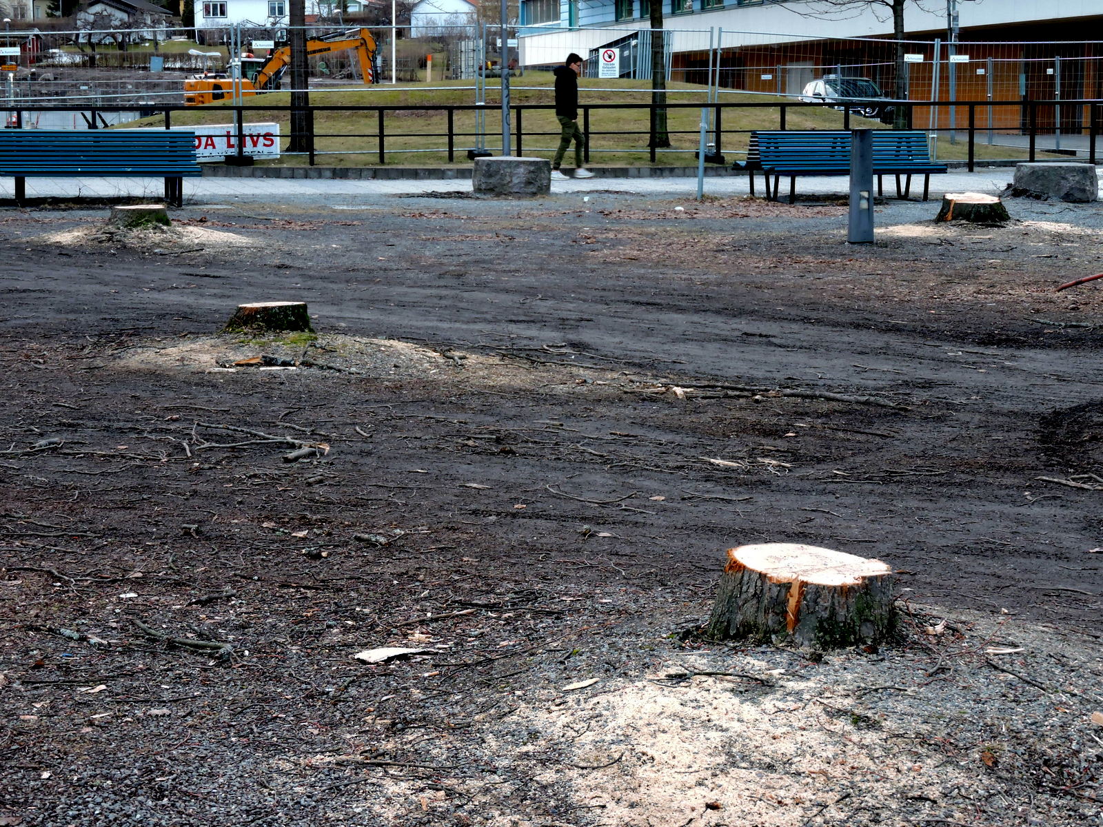 De har tagit ner ett träd aha, men oj där är flera rötter och plötsligt såg jag, de har sågat ner alla lindar som stått i mer än 50 år mellan gymnasiet och centrumhusen. Här ska bli park, men hade man inte kunnat låta träden ingå på något vis i  den nya ”blå” parken? De var definitivt inte sjuka.