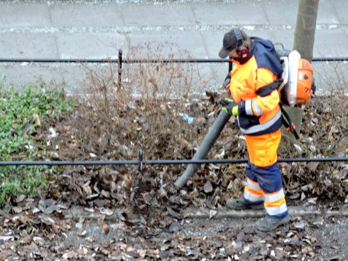 En dag hörde jag hur något ljud låg på men förstod inte varifrån det kom, jag letade i alla rum om det var någon apparat som råkat sättas på, som den gången rakapparaten låg och surrade i badrummet och jag ringde på hos Barbro för att fråga om hon också hörde något. Det kunde jag inte göra en gång till så jag tittade ut och det borde jag förstås gjort tidigare, det var lövblåsaren. Han blåste bort löven som trängt ner bland buskarna i gatuplanteringen och jord, löv och småsten for omkring i luften.Att göra plats för den nya grönskan var ett välkommet vårtecken.. Den här gången hade blåsaren både hörselskydd och något för näsan.